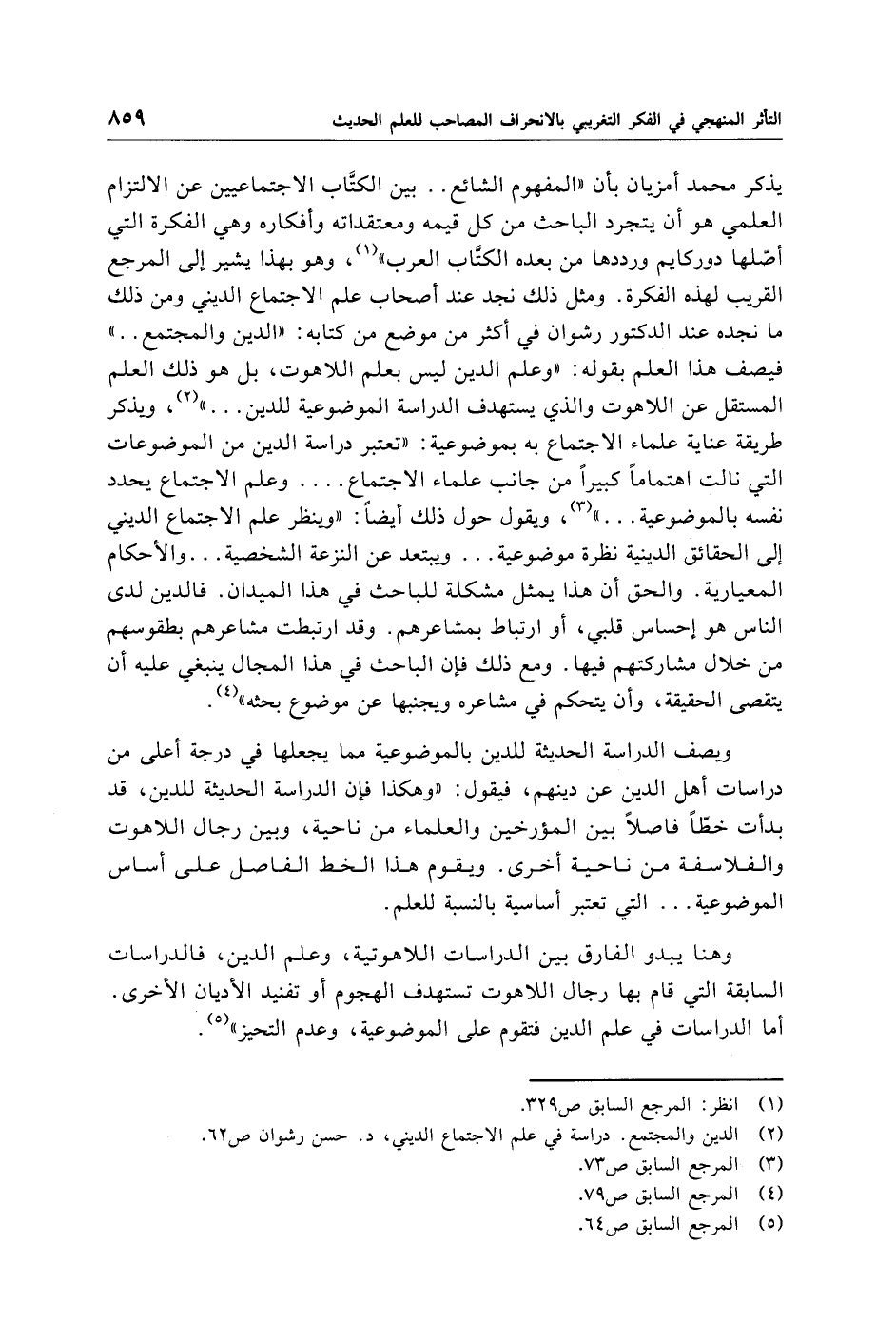 يذكر محمَّد أمزيان بأن "المفهوم الشائع .. بين الكتَّاب الاجتماعيين عن الالتزام العلمي هو أن يتجرد الباحث من كل قيمه ومعتقداته وأفكاره وهي الفكرة التي أصّلها دوركايم ورددها من بعده الكتَّاب العرب" (¬1)، وهو بهذا يشير إلى المرجع القريب لهذه الفكرة. ومثل ذلك نجد عند أصحاب علم الاجتماع الديني ومن ذلك ما نجده عند الدكتور رشوان في أكثر من موضع من كتابه: "الدين والمجتمع. ." فيصف هذا العلم بقوله: "وعلم الدين ليس بعلم اللاهوت، بل هو ذلك العلم المستقل عن اللاهوت والذي يستهدف الدراسة الموضوعية للدين. . . ." (¬2)، ويذكر طريقة عناية علماء الاجتماع به بموضوعية: "تعتبر دراسة الدين من الموضوعات التي نالت اهتمامًا كبيرًا من جانب علماء الاجتماع. . . . وعلم الاجتماع يحدد نفسه بالموضوعية. . . ." (¬3)، ويقول حول ذلك أيضًا: "وينظر علم الاجتماع الديني إلى الحقائق الدينية نظرة موضوعية. . . . ويبتعد عن النزعة الشخصية. . . . والأحكام المعيارية. والحق أن هذا يمثل مشكلة للباحث في هذا الميدان. فالدين لدى الناس هو إحساس قلبي، أو ارتباط بمشاعرهم. وقد ارتبطت مشاعرهم بطقوسهم من خلال مشاركتهم فيها. ومع ذلك فإن الباحث في هذا المجال ينبغي عليه أن يتقصى الحقيقة، وأن يتحكم في مشاعره ويجنبها عن موضوع بحثه" (¬4).