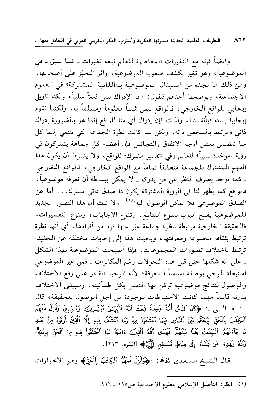وأيضًا فإنه مع التغيرات المعاصرة للعلم تبعه تغيرات -كما سبق- في الموضوعية، وهو تغير يكشف صعوبة الموضوعية، وأثر التحيّز على أصحابها، ومن ذلك ما نجده من استبدال الموضوعية بـ "الذاتية المشتركة" في العلوم الاجتماعية، ويوضحها أحدهم فيقول: "إن الإدراك ليس فعلًا سلبيًا، ولكنه تأويل إيجابي للواقع الخارجي، فالواقع ليس شيئًا معلومًا ومسلمًا به، ولكننا نقوم إيجابيًا ببنائه "بأنفسنا"، ولذلك فإن إدراك أي منا للواقع إنما هو بالضرورة إدراك ذاتي ومرتبط بالشخص ذاته، ولكن لما كانت نظرة الجماعة التي ينتمي إليها كل منا تتضمن بعض أوجه الاتفاق والتجانس فإن أعضاء كل جماعة يشتركون في رؤية "موحّدة نسبيًا" للعالم وفي "تفسير مشترك" للواقع، ولا يشترط أن يكون هذا الفهم المشترك للجماعة متطابقًا تمامًا مع الواقع الخارجي، فالواقع الخارجي -كما يوجد بصرف النظر عن من يدركه- لا يمكن ببساطة أن نعرفه موضوعيًا، فالواقع كما يظهر لنا في الرؤية المشتركة يكون ذا صدق ذاتي مشترك. . . . أما عن الصدق الموضوعي فلا يمكن الوصول إليه" (¬1). ولا شك أن هذا التصور الجديد للموضوعية يفتح الباب لتنوع النتائج، وتنوع الإجابات، وتنوع التفسيرات، فالحقيقة الخارجية مرتبطة بنظرة جماعة عبّر عنها فرد من أفرادها، أي أنها نظرة ترتبط بثقافة مجموعة ومعرفتها، ويحيلنا هذا إلى إجابات مختلفة عن الحقيقة ترتبط باختلاف تصورات المجموعات. فإذا أصبحت الموضوعية بهذا الشكل -على أنه شكلها حتى قبل هذه التحولات رغم المكابرات- فمن غير الموضوعي استبعاد الوحي بوصفه أساسًا للمعرفة؛ لأنه الوحيد القادر على رفع الاختلاف والوصول لنتائج موضوعية تركن لها النفس بكل طمأنينة، وسيبقى الاختلاف بدونه قائمًا مهما كانت الاحتياطات موجودة من أجل الوصول للحقيقة، قال -تعالى-: {كَانَ النَّاسُ أُمَّةً وَاحِدَةً فَبَعَثَ اللَّهُ النَّبِيِّينَ مُبَشِّرِينَ وَمُنْذِرِينَ وَأَنْزَلَ مَعَهُمُ الْكِتَابَ بِالْحَقِّ لِيَحْكُمَ بَيْنَ النَّاسِ فِيمَا اخْتَلَفُوا فِيهِ وَمَا اخْتَلَفَ فِيهِ إِلَّا الَّذِينَ أُوتُوهُ مِنْ بَعْدِ مَا جَاءَتْهُمُ الْبَيِّنَاتُ بَغْيًا بَيْنَهُمْ فَهَدَى اللَّهُ الَّذِينَ آمَنُوا لِمَا اخْتَلَفُوا فِيهِ مِنَ الْحَقِّ بِإِذْنِهِ وَاللَّهُ يَهْدِي مَنْ يَشَاءُ إِلَى صِرَاطٍ مُسْتَقِيمٍ (213)} [البقرة: 213].