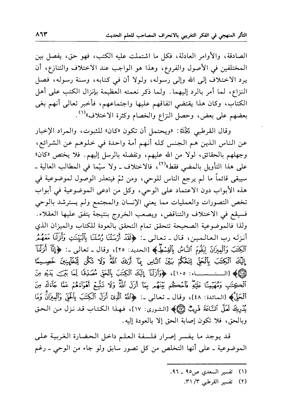 وقال القرطبي -رحمه الله-: "ويحتمل أن تكون "كان" للثبوت، والمراد الإخبار عن الناس الذين هم الجنس كله أنهم أمة واحدة في خلوهم عن الشرائع، وجهلهم بالحقائق، لولا من الله عليهم، وتفضله بالرسل إليهم. فلا يختص "كان" على هذا التأويل بالمضي فقط" (¬2)، فالاختلاف -ولاسيّما في المطالب العالية- سيبقى قائمًا ما لم يرجع الناس للوحي، ومن ثمّ فيتعذر الوصول لموضوعية في هذه الأبواب دون الاعتماد على الوحي، وكل من ادعى الموضوعية في أبواب تخص التصورات والعمليات مما يعني الإنسان والمجتمع ولم يسترشد بالوحي فسيقع في الاختلاف والتناقض، ويصعب الخروج بنتيجة يتفق عليها العقلاء. ولذا فالموضوعية الصحيحة تتحقق تمام التحقق بالعودة للكتاب والميزان الذي أنزله رب العالمين، قال -تعالى-: {لَقَدْ أَرْسَلْنَا رُسُلَنَا بِالْبَيِّنَاتِ وَأَنْزَلْنَا مَعَهُمُ الْكِتَابَ وَالْمِيزَانَ لِيَقُومَ النَّاسُ بِالْقِسْطِ} [الحديد: 25]، وقال -تعالى-: {إِنَّا أَنْزَلْنَا إِلَيْكَ الْكِتَابَ بِالْحَقِّ لِتَحْكُمَ بَيْنَ النَّاسِ بِمَا أَرَاكَ اللَّهُ وَلَا تَكُنْ لِلْخَائِنِينَ خَصِيمًا (105)} [النساء: 105]، {وَأَنْزَلْنَا إِلَيْكَ الْكِتَابَ بِالْحَقِّ مُصَدِّقًا لِمَا بَيْنَ يَدَيْهِ مِنَ الْكِتَابِ وَمُهَيْمِنًا عَلَيْهِ فَاحْكُمْ بَيْنَهُمْ بِمَا أَنْزَلَ اللَّهُ وَلَا تَتَّبِعْ أَهْوَاءَهُمْ عَمَّا جَاءَكَ مِنَ الْحَقِّ} [المائدة: 48]، وقال -تعالى-: {اللَّهُ الَّذِي أَنْزَلَ الْكِتَابَ بِالْحَقِّ وَالْمِيزَانَ وَمَا يُدْرِيكَ لَعَلَّ السَّاعَةَ قَرِيبٌ (17)} [الشورى: 17]، فهذا الكتاب قد نزل من الحق وبالحق، فلا تكون إصابة الحق إلا بالعودة إليه.