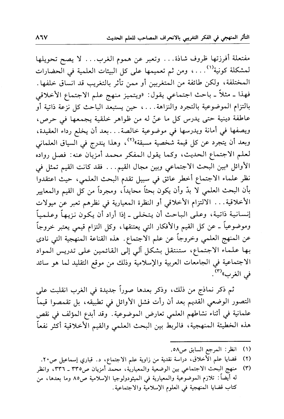 (¬3) منهج البحث الاجتماعي بين الوضعية والمعيارية، محمَّد أمزيان ص 335 - 336، وانظر له أيضًا: تلازم الموضوعية والمعيارية في الميثودولوجيا الإِسلامية ص 85 وما بعدها، من كتاب قضايا المنهجية في العلوم الإِسلامية والاجتماعية.