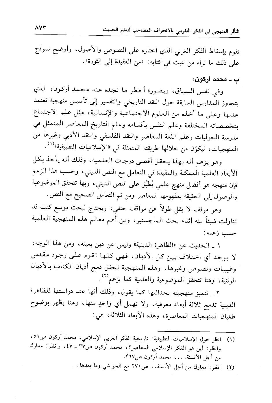 (¬1) انظر حول الإِسلاميات التطبيقية: تاريخية الفكر العربي الإِسلامي، محمَّد أركون ص 51، وانظر: أين هو الفكر الإِسلامي المعاصر؟، محمَّد أركون ص 37 - 47، وانظر: معارك من أجل الأنسنة. . . .، محمَّد أركون ص 267.