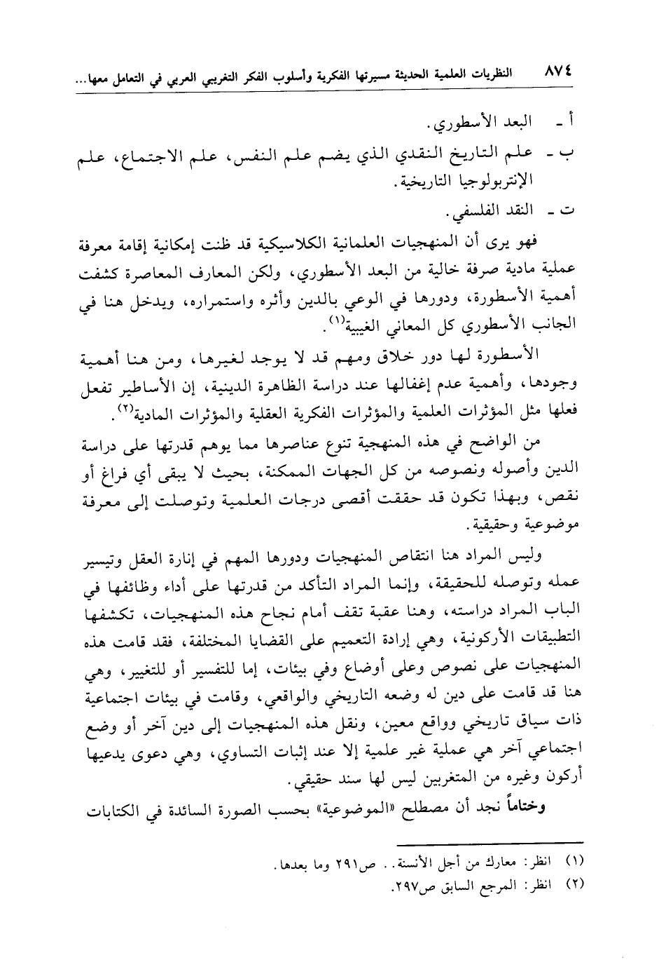 وليس المراد هنا انتقاص المنهجيات ودورها المهم في إنارة العقل وتيسير عمله وتوصله للحقيقة، وإنما المراد التأكد من قدرتها على أداء وظائفها في الباب المراد دراسته، وهنا عقبة تقف أمام نجاح هذه المنهجيات، تكشفها التطبيقات الأركونية، وهي إرادة التعميم على القضايا المختلفة، فقد قامت هذه المنهجيات على نصوص وعلى أوضاع وفي بيئات، إما للتفسير أو للتغيير، وهي هنا قد قامت على دين له وضعه التاريخي والواقعي، وقامت في بيئات اجتماعية ذات سياق تاريخي وواقع معين، ونقل هذه المنهجيات إلى دين آخر أو وضع اجتماعي آخر هي عملية غير علمية إلا عند إثبات التساوي، وهي دعوى يدعيها أركون وغيره من المتغربين ليس لها سند حقيقي.