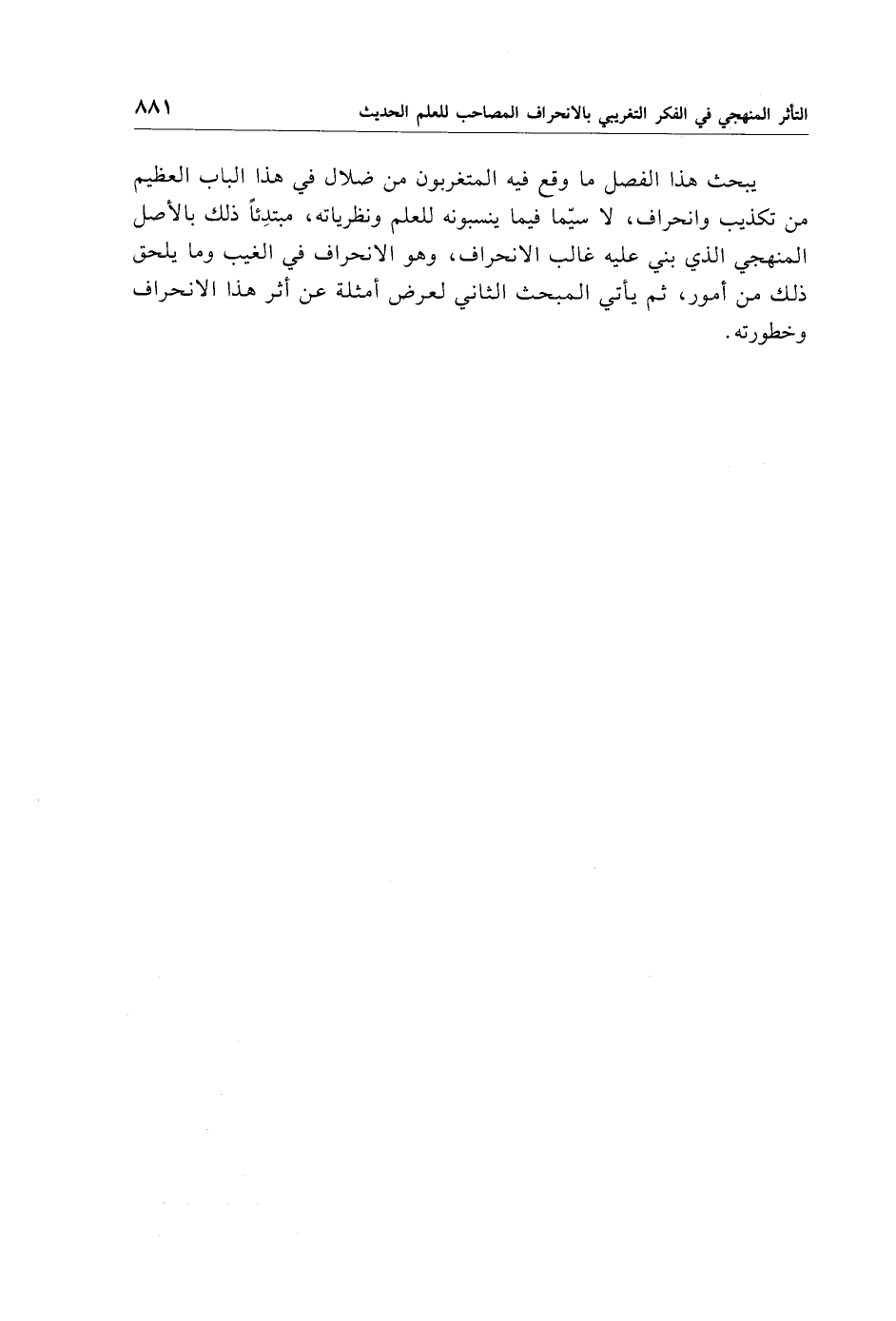يبحث هذا الفصل ما وقع فيه المتغربون من ضلال في هذا الباب العظيم من تكذيب وانحراف، لاسيّما فيما ينسبونه للعلم ونظرياته، مبتدِئًا ذلك بالأصل المنهجي الذي بني عليه غالب الانحراف، وهو الانحراف في الغيب وما يلحق ذلك من أمور، ثم يأتي المبحث الثاني لعرض أمثلة عن أثر هذا الانحراف وخطورته.
