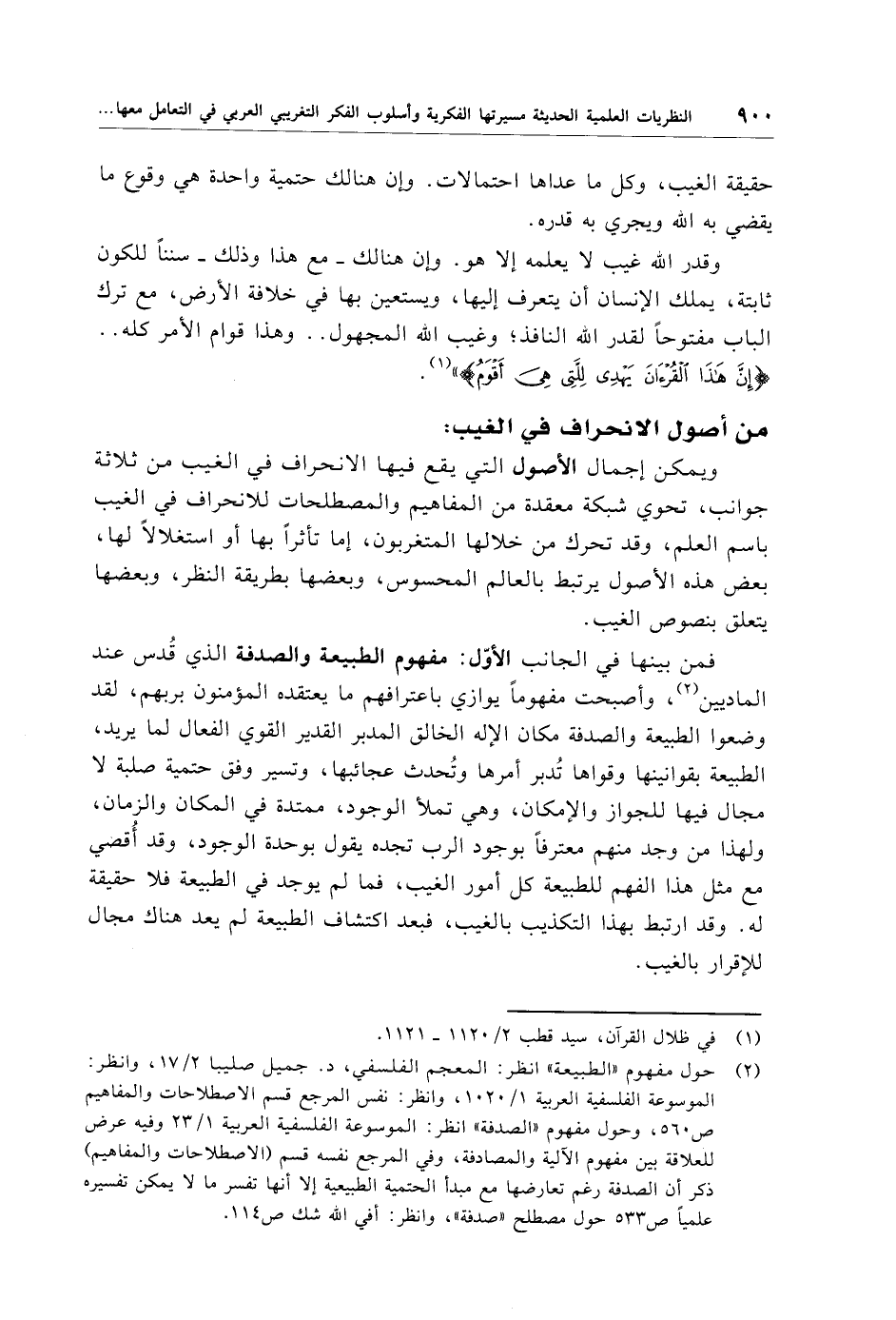 (¬2) حول مفهوم "الطبيعة" انظر: المعجم الفلسفي، د. جميل صليبا 2/ 17، وانظر: الموسوعة الفلسفية العربية 1/ 1020، وانظر: نفس المرجع قسم الاصطلاحات والمفاهيم ص 560، وحول مفهوم "الصدفة" انظر: الموسوعة الفلسفية العربية 1/ 23 وفيه عرض للعلاقة بين مفهوم الآلية والمصادفة، وفي المرجع نفسه قسم (الاصطلاحات والمفاهيم) ذكر أن الصدفة رغم تعارضها مع مبدأ الحتمية الطبيعية إلا أنها تفسر ما لا يمكن تفسيره علميًا ص 533 حول مصطلح "صدفة"، وانظر: أفي الله شك ص 114.