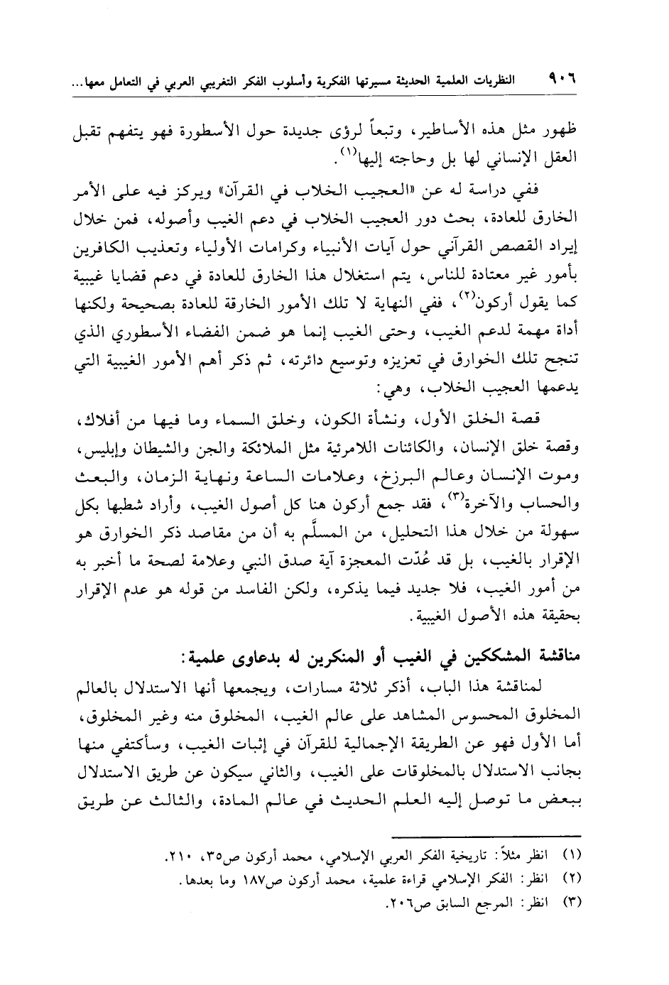 قصة الخلق الأول، ونشأة الكون، وخلق السماء وما فيها من أفلاك، وقصة خلق الإنسان، والكائنات اللامرئية مثل الملائكة والجن والشيطان وإبليس، وموت الإنسان وعالم البرزخ، وعلامات الساعة ونهاية الزمان، والبعث والحساب والآخرة (¬3)، فقد جمع أركون هنا كل أصول الغيب، وأراد شطبها بكل سهولة من خلال هذا التحليل، من المسلَّم به أن من مقاصد ذكر الخوارق هو الإقرار بالغيب، بل قد عُدّت المعجزة آية صدق النبي وعلامة لصحة ما أخبر به من أمور الغيب، فلا جديد فيما يذكره، ولكن الفاسد من قوله هو عدم الإقرار بحقيقة هذه الأصول الغيبية.