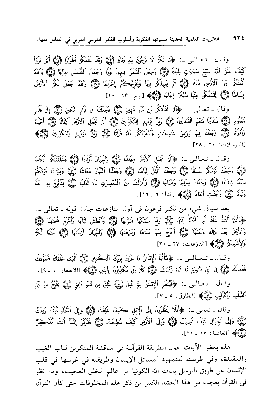 هذه بعض الآيات حول الطريقة القرآنية في مناقشة المنكرين لباب الغيب والعقيدة، وفي طريقته للتمهيد لمسائل الإيمان وطريقته في غرسها في قلب الإنسان عن طريق التوسل بآيات الله الكونية من عالم الخلق العجيب، ومن نظر في القرآن يعجب من هذا الحشد الكبير من ذكر هذه المخلوقات حتى كأن القرآن
