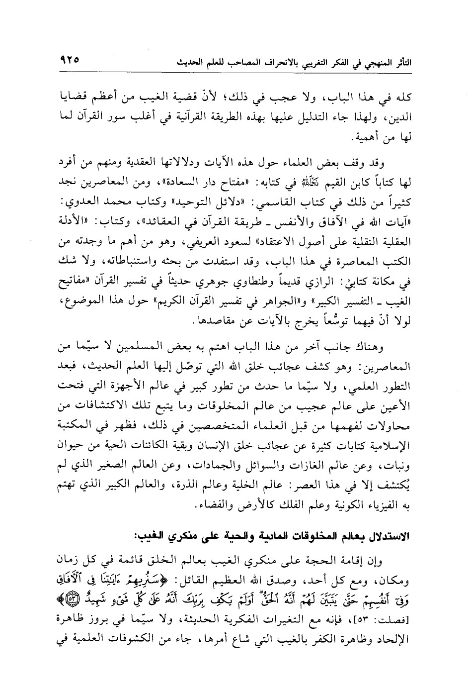 وإن إقامة الحجة على منكري الغيب بعالم الخلق قائمة في كل زمان ومكان، ومع كل أحد، وصدق الله العظيم القائل: {سَنُرِيهِمْ آيَاتِنَا فِي الْآفَاقِ وَفِي أَنْفُسِهِمْ حَتَّى يَتَبَيَّنَ لَهُمْ أَنَّهُ الْحَقُّ أَوَلَمْ يَكْفِ بِرَبِّكَ أَنَّهُ عَلَى كُلِّ شَيْءٍ شَهِيدٌ (53)}، فإنه مع التغيرات الفكرية الحديثة، ولاسيّما في بروز ظاهرة الإلحاد وظاهرة الكفر بالغيب التي شاع أمرها، جاء من الكشوفات العلمية في
