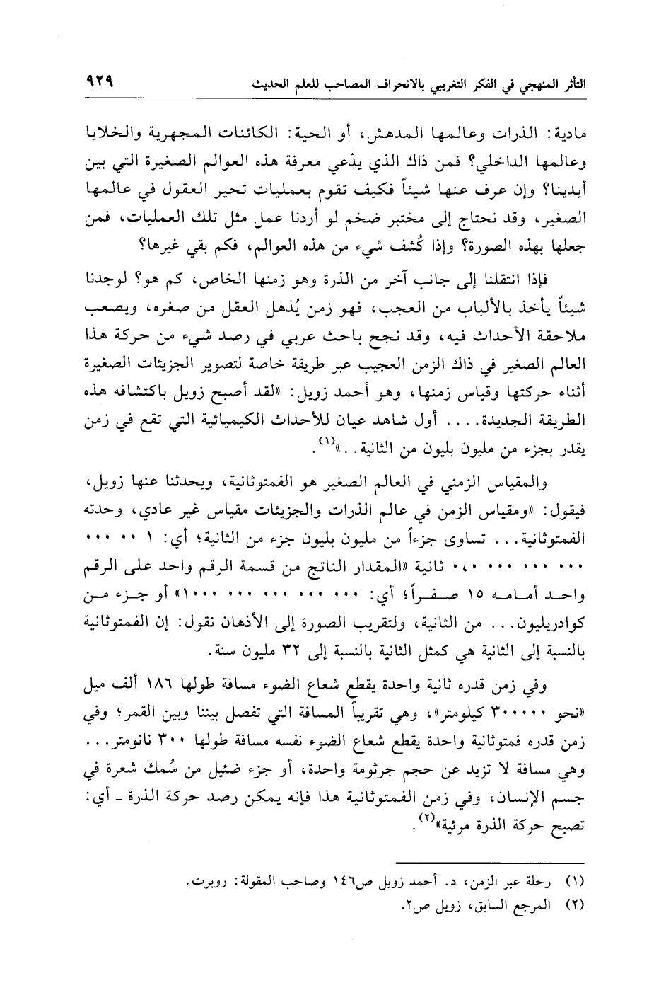 وفي زمن قدره ثانية واحدة يقطع شعاع الضوء مسافة طولها 186 ألف ميل "نحو 300000 كيلومتر"، وهي تقريبًا المسافة التي تفصل بيننا وبين القمر؛ وفي زمن قدره فمتوثانية واحدة يقطع شعاع الضوء نفسه مسافة طولها 300 نانومتر. . . . وهي مسافة لا تزيد عن حجم جرثومة واحدة، أو جزء ضئيل من سُمك شعرة في جسم الإنسان، وفي زمن الفمتوثانية هذا فإنه يمكن رصد حركة الذرة -أي: تصبح حركة الذرة مرئية" (¬2).