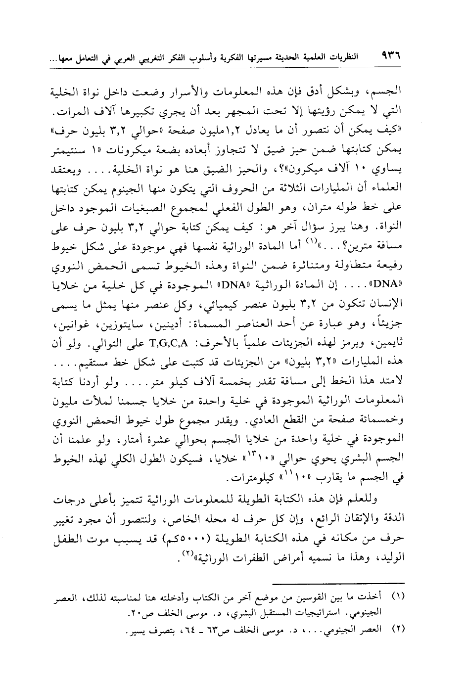 (¬1) أخذت ما بين القوسين من موضع آخر من الكتاب وأدخلته هنا لمناسبته لذلك، العصر الجينومي. استراتيجيات المستقبل البشري، د. موسى الخلف ص 20.