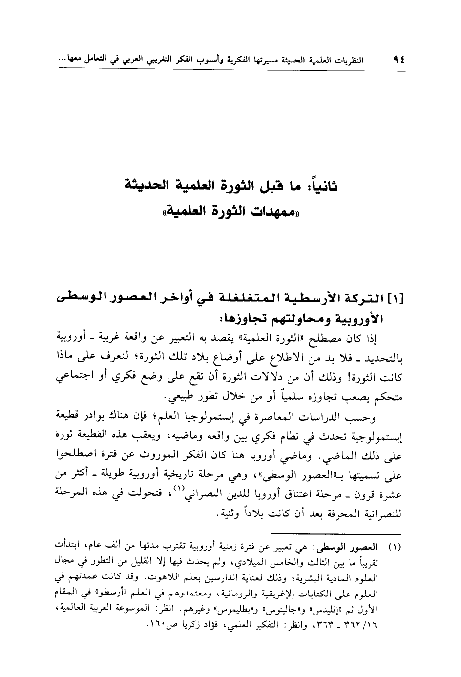 (¬1) العصور الوسطى: هي تعبير عن فترة زمنية أوروبية تقترب مدتها من ألف عام، ابتدأت تقريبًا ما بين الثالث والخامس الميلادي، ولم يحدث فيها إلا القليل من التطور في مجال العلوم المادية البشرية؛ وذلك لعناية الدارسين بعلم اللاهوت. وقد كانت عمدتهم في العلوم على الكتابات الإغريقية والرومانية، ومعتمدوهم في العلم "أرسطو" في المقام الأول ثم "إقليدس" و"جالينوس" و"بطليموس" وغيرهم. انظر: الموسوعة العربية العالمية، 16/ 362 - 363، وانظر: التفكير العلمي، فؤاد زكريا ص 160.