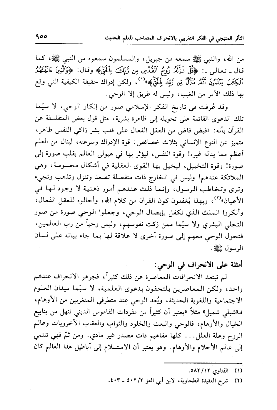 لم تبتعد الانحرافات المعاصرة عن ذلك كثيرًا، فجوهر الانحراف عندهم واحد، ولكن المعاصرين يلتحفون بدعوى العلمية، لاسيّما ميدان العلوم الاجتماعية واللغوية الحديثة، وُيعد الوحي عند متطرفي المتغربين من الأوهام، فـ "شبلي شميل" مثلًا "يعتبر أن كثيرًا من مفردات القاموس الديني تنهل من ينابيع الخيال والأوهام، فالوحي والبعث والخلود والثواب والعقاب الأخرويات وعالم الروح وعلة العلل. . . . كلها مفاهيم ذات مصدر غير مادي. ومن ثمّ فهي تنتمي إلى عالم الأحلام والأوهام. وهو يعتبر أن الاستسلام إلى أباطيل هذا العالم كان