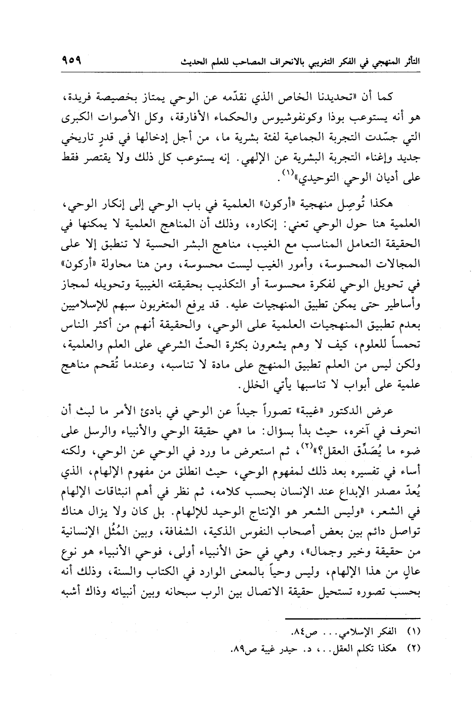 هكذا تُوصِل منهجية "أركون" العلمية في باب الوحي إلى إنكار الوحي، العلمية هنا حول الوحي تعني: إنكاره، وذلك أن المناهج العلمية لا يمكنها في الحقيقة التعامل المناسب مع الغيب، مناهج البشر الحسية لا تنطبق إلا على المجالات المحسوسة، وأمور الغيب ليست محسوسة، ومن هنا محاولة "أركون" في تحويل الوحي لفكرة محسوسة أو التكذيب بحقيقته الغيبية وتحويله لمجاز وأساطير حتى يمكن تطبيق المنهجيات عليه. قد يرفع المتغربون سبهم للإسلاميين بعدم تطبيق المنهجيات العلمية على الوحي، والحقيقة أنهم من أكثر الناس تحمسًا للعلوم، كيف لا وهم يشعرون بكثرة الحثّ الشرعي على العلم والعلمية، ولكن ليس من العلم تطبيق المنهج على مادة لا تناسبه، وعندما تُقحم مناهج علمية على أبواب لا تناسبها يأتي الخلل.