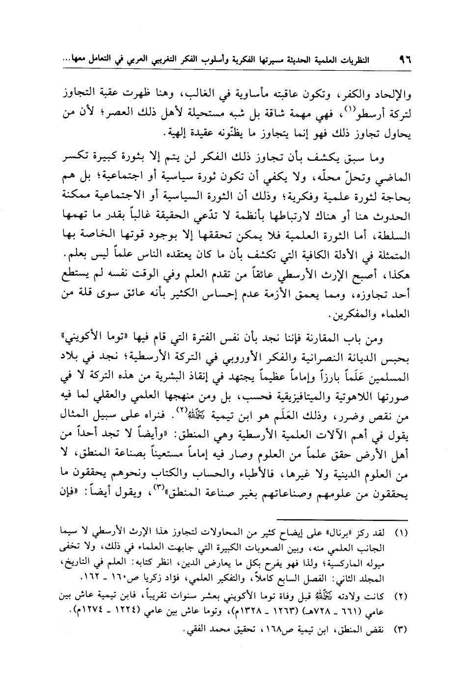 ومن باب المقارنة فإننا نجد بأن نفس الفترة التي قام فيها "توما الأكويني" بحبس الديانة النصرانية والفكر الأوروبي في التركة الأرسطية؛ نجد في بلاد المسلمين عَلَمًا بارزًا وإمامًا عظيمًا يجتهد في إنقاذ البشرية من هذه التركة لا في صورتها اللاهوتية والميتافيزيقية فحسب، بل ومن منهجها العلمي والعقلي لما فيه من نقص وضرر، وذلك العَلَم هو ابن تيمية - رحمه الله - (¬2). فنراه على سبيل المثال يقول في أهم الآلات العلمية الأرسطية وهي المنطق: "وأيضًا لا تجد أحدًا من أهل الأرض حقق علمًا من العلوم وصار فيه إمامًا مستعينًا بصناعة المنطق، لا من العلوم الدينية ولا غيرها، فالأطباء والحساب والكتاب ونحوهم يحققون ما يحققون من علومهم وصناعاتهم بغير صناعة المنطق" (¬3)، ويقول أيضًا: "فإن