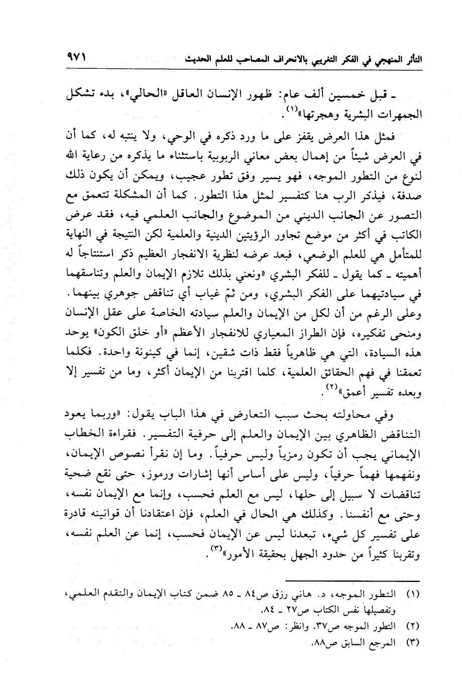 فمثل هذا العرض يقفز على ما ورد ذكره في الوحي، ولا ينتبه له، كما أن في العرض شيئًا من إهمال بعض معاني الربوبية باستثناء ما يذكره من رعاية الله لنوع من التطور الموجه، فهو يسير وفق تطور عجيب، ويمكن أن يكون ذلك صدفة، فيذكر الرب هنا كتفسير لمثل هذا التطور. كما أن المشكلة تتعمق مع التصور عن الجانب الديني من الموضوع والجانب العلمي فيه، فقد عرض الكاتب في أكثر من موضع تجاور الرؤيتين الدينية والعلمية لكن النتيجة في النهاية للمتأمل هي للعلم الوضعي، فبعد عرضه لنظرية الانفجار العظيم ذكر استنتاجًا له أهميته -كما يقول- للفكر البشري "ونعني بذلك تلازم الإيمان والعلم وتناسقهما في سيادتيهما على الفكر البشري، ومن ثمّ غياب أي تناقض جوهري بينهما. وعلى الرغم من أن لكل من الإيمان والعلم سيادته الخاصة على عقل الإنسان ومنحى تفكيره، فإن الطراز المعياري للانفجار الأعظم "أو خلق الكون" يوحد هذه السيادة، التي هي ظاهريًا فقط ذات شقين، إنما في كينونة واحدة. فكلما تعمقنا في فهم الحقائق العلمية، كلما اقتربنا من الإيمان أكثر، وما من تفسير إلا وبعده تفسير أعمق" (¬2).
