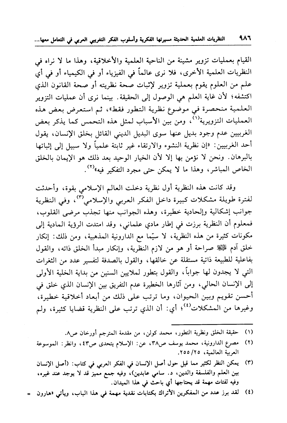 (¬2) مصرع الدارونية، محمَّد يوسف ص 38، عن: الإِسلام يتحدى ص 43، وانظر: الموسوعة العربية العالمية، 25/ 255.