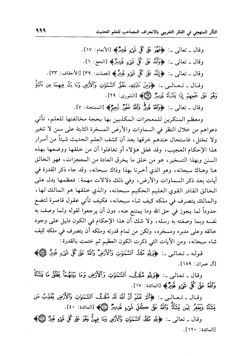 ومعظم المنكرين للمعجزات المكذبين بها بحجة مخالفتها للعلم، تأتي دعواهم من خلال النظر في السماوات والأرض المسخرة الثابتة على سنن لا تتغير ولا تختل، فاستحال عندهم خرقها بعد أن كشف العلم الحديث شيئًا من أسرار هذا الإحكام العجيب، وقد غفل هؤلاء أو تغافلوا أن من خلقها ووضعها بهذه السنن وبهذا التسخير، هو من خلق ما يخرق العادة من المعجزات، فهو الخالق هنا وهناك سبحانه، وهو الذي أخبرنا بهذا وذاك سبحانه، وقد جاء ذكر القدرة في آيات بعد ذكر السماوات والأرض، وفي ذلك دلالات مهمة: فعظمها يدل على الخالق القادر القوي العليم الحكيم سبحانه، والذي خلقها هو المالك لها، والمالك يتصرف في ملكه كيف شاء سبحانه، فكيف تأتي عقول قاصرة لتضع حدودًا لما يجوز في حق الله وما يمتنع عنه، دون أن يرجعوا لقوله ولما وصف به نفسه وبما وصفته به رسله، ولا شك أن هذا الإحكام في الكون دليل على وجود خالقه وعلى مدبره ومسخره، ولكن من تمام قدرته وملكه أن يتصرف في ملكه كيف شاء سبحانه، ومن الآيات التي ذكرت الكون العظيم ثم ختمت بالقدرة: