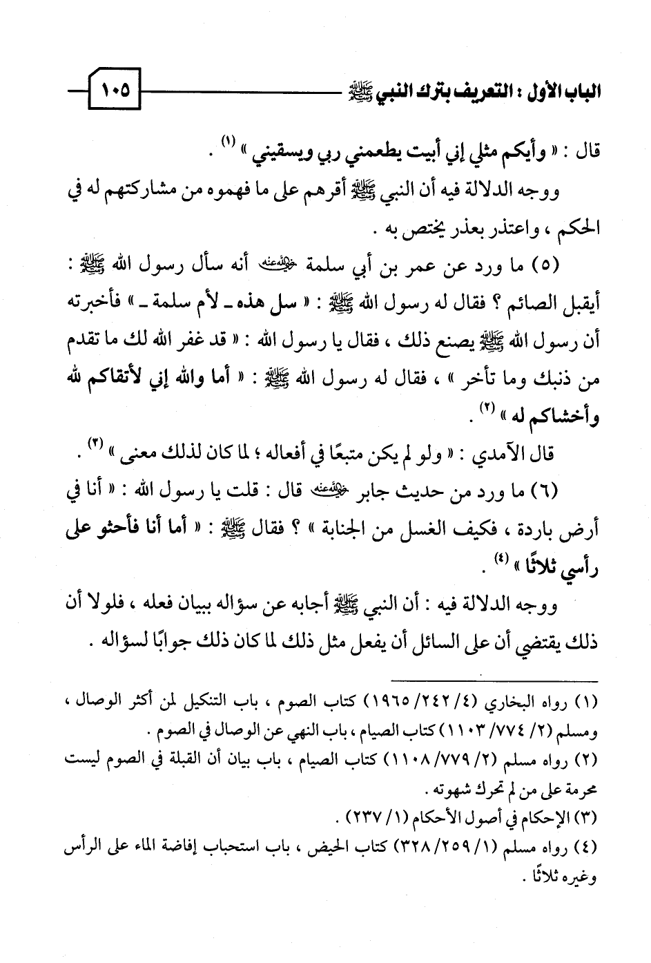 (٥) ما ورد عن عمر بن أبي سلمة - رضي الله عنه - أنه سأل رسول الله - صلى الله عليه وسلم -: أيقبل الصائم؟ فقال له رسول الله - صلى الله عليه وسلم -: "سل هذه - لأم سلمة - " فأخبرته أن رسول الله - صلى الله عليه وسلم - يصنع ذلك، فقال يا رسول الله: "قد غفر الله لك ما تقدم من ذنبك وما تأخر"، فقال له رسول الله - صلى الله عليه وسلم -: "أما والله إني لأتقاكم لله وأخشاكم له" (٢).
