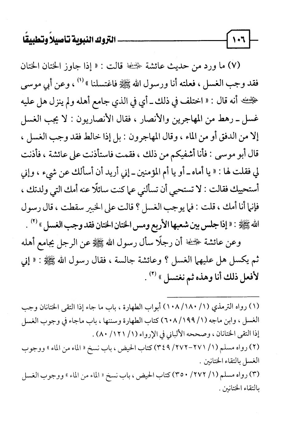 (٣) رواه مسلم (١/ ٢٧٢ / ٣٥٠) كتاب الحيض، باب نسح "الماء من الماء" ووجوب الغسل بالتقاء الختانين.