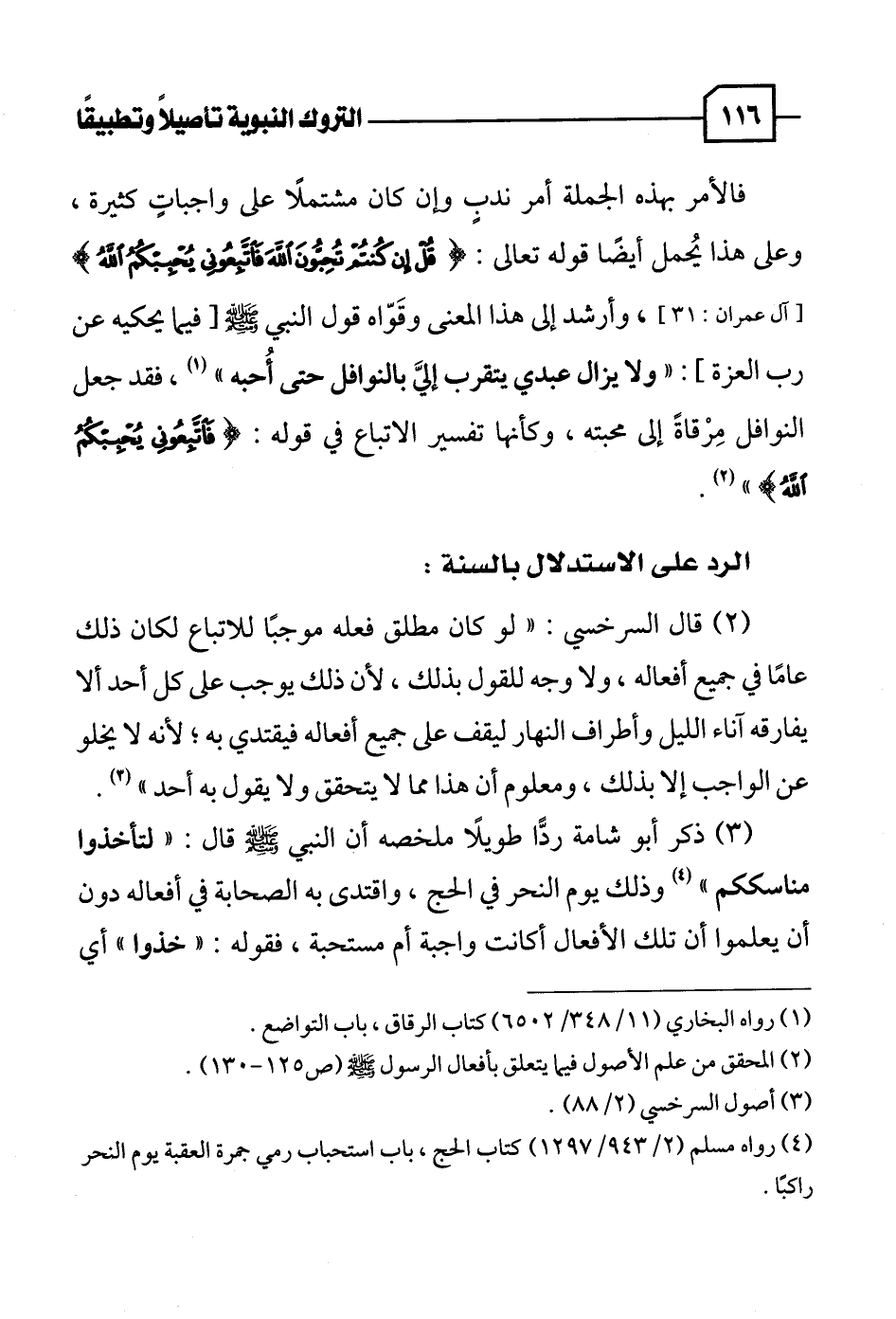 (٢) قال السرخسي: "لو كان مطلق فعله موجبًا للاتباع لكان ذلك عامًا في جميع أفعاله، ولا وجه للقول بذلك، لأن ذلك يوجب على كل أحد ألا يفارقه آناء الليل وأطراف النهار ليقف على جميع أفعاله فيقتدي به؛ لأنه لا يخلو عن الواجب إلا بذلك، ومعلوم أن هذا مما لا يتحقق ولا يقول به أحد " (٣).