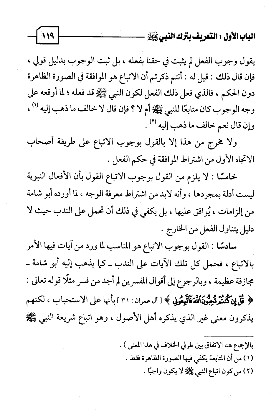 سادسًا: القول بوجوب الاتباع هو المناسب لما ورد من آيات فيها الأمر بالاتباع، فحمل كل تلك الآيات على الندب - كما يذهب إليه أبو شامة - مجازفة عظيمة، وبالرجوع إلى أقوال المفسرين لم أجد من فسر مثلًا قوله تعالى: {قُلْ إِنْ كُنْتُمْ تُحِبُّونَ اللَّهَ فَاتَّبِعُونِي} [آل عمران: ٣١] بأنها على الاستحباب، لكنهم يذكرون معنى غير الذي يذكره أهل الأصول، وهو اتباع شريعة النبي - صلى الله عليه وسلم -