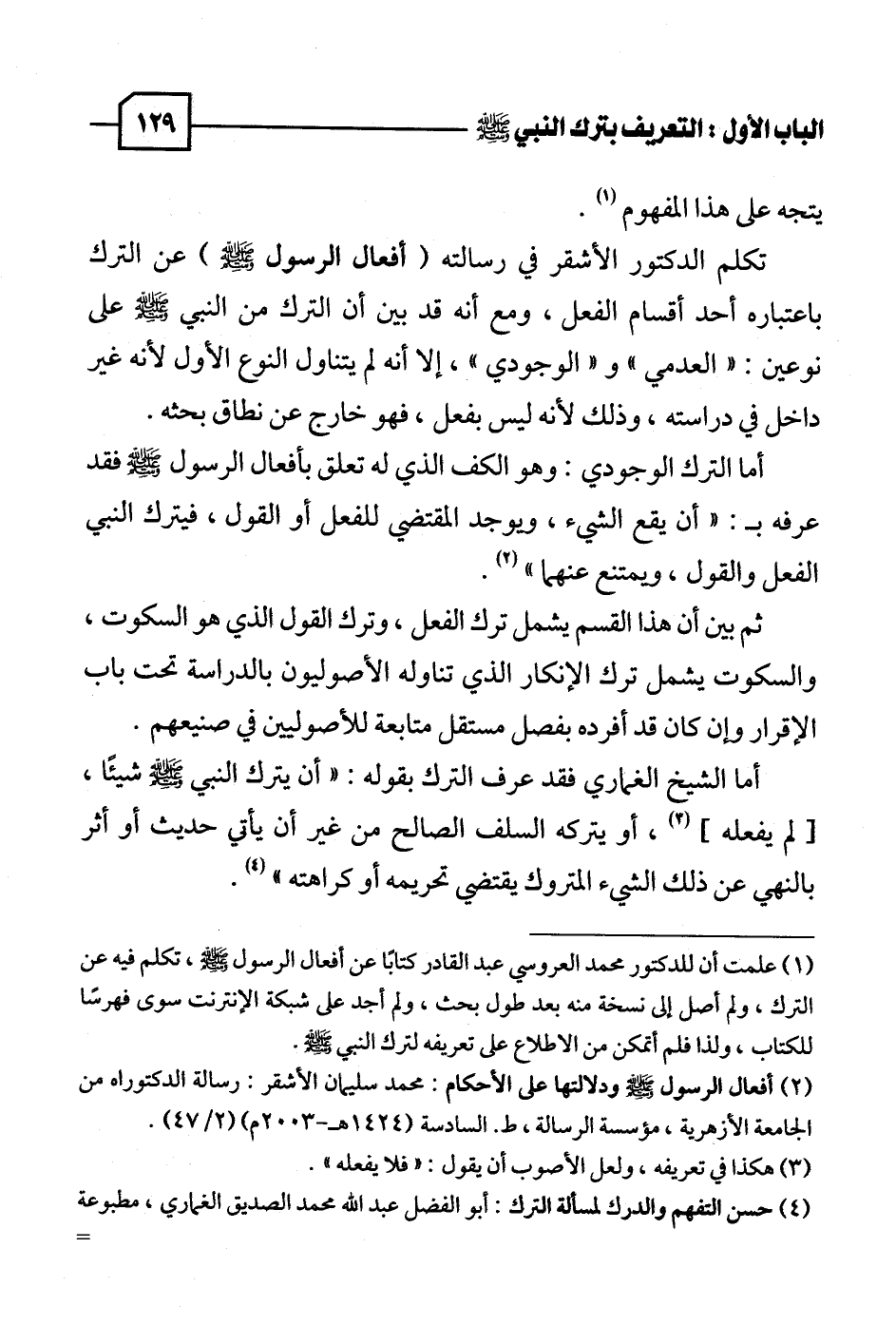 (١) علمت أن للدكتور محمد العروسي عبد القادر كتابًا عن أفعال الرسول - صلى الله عليه وسلم -، تكلم فيه عن الترك، ولم أصل إلى نسخة منه بعد طول بحث، ولم أجد على شبكة الإنترنت سوى فهرسًا للكتاب، ولذا فلم أتمكن من الاطلاع على تعريفه لترك النبي - صلى الله عليه وسلم -.