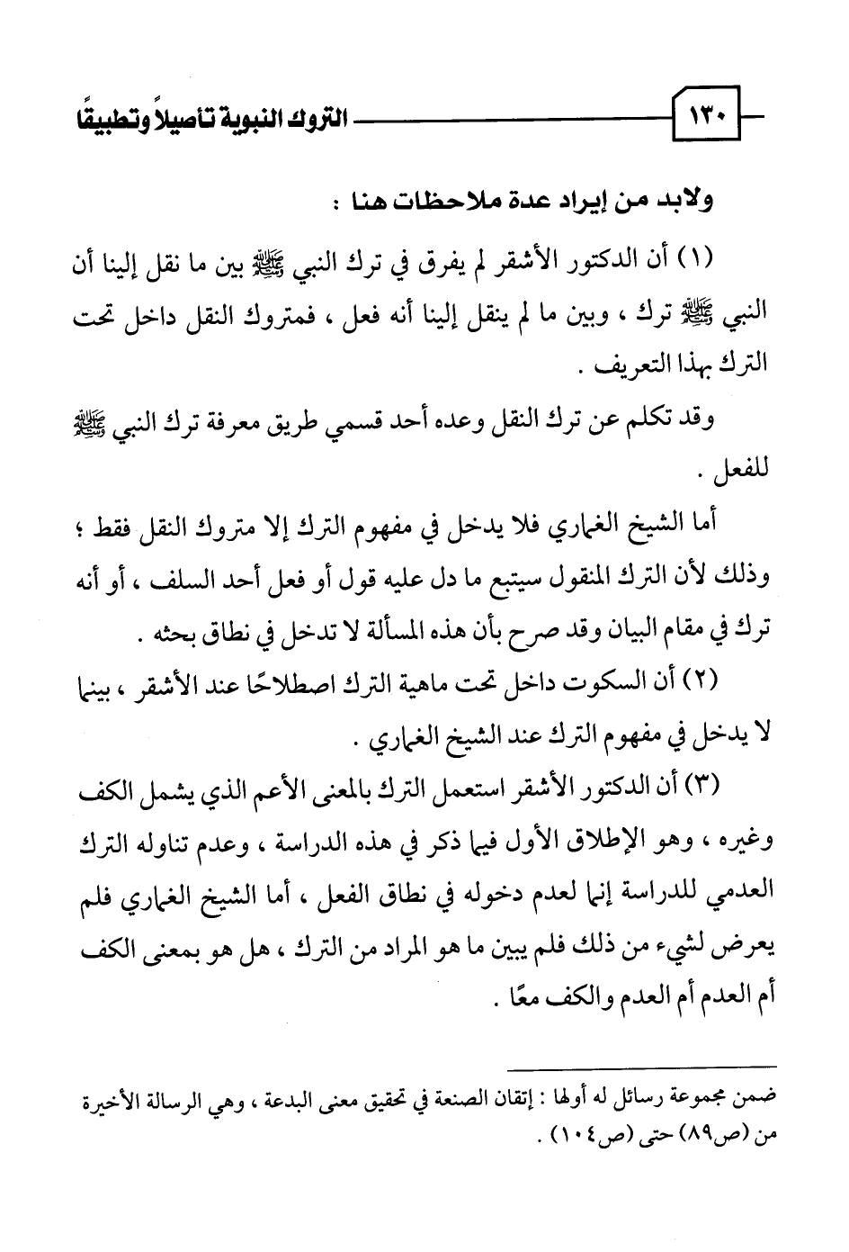 (١) أن الدكتور الأشقر لم يفرق في ترك النبي - صلى الله عليه وسلم - بين ما نقل إلينا أن النبي - صلى الله عليه وسلم - ترك، وبين ما لم ينقل إلينا أنه فعل، فمتروك النقل داخل تحت الترك بهذا التعريف.