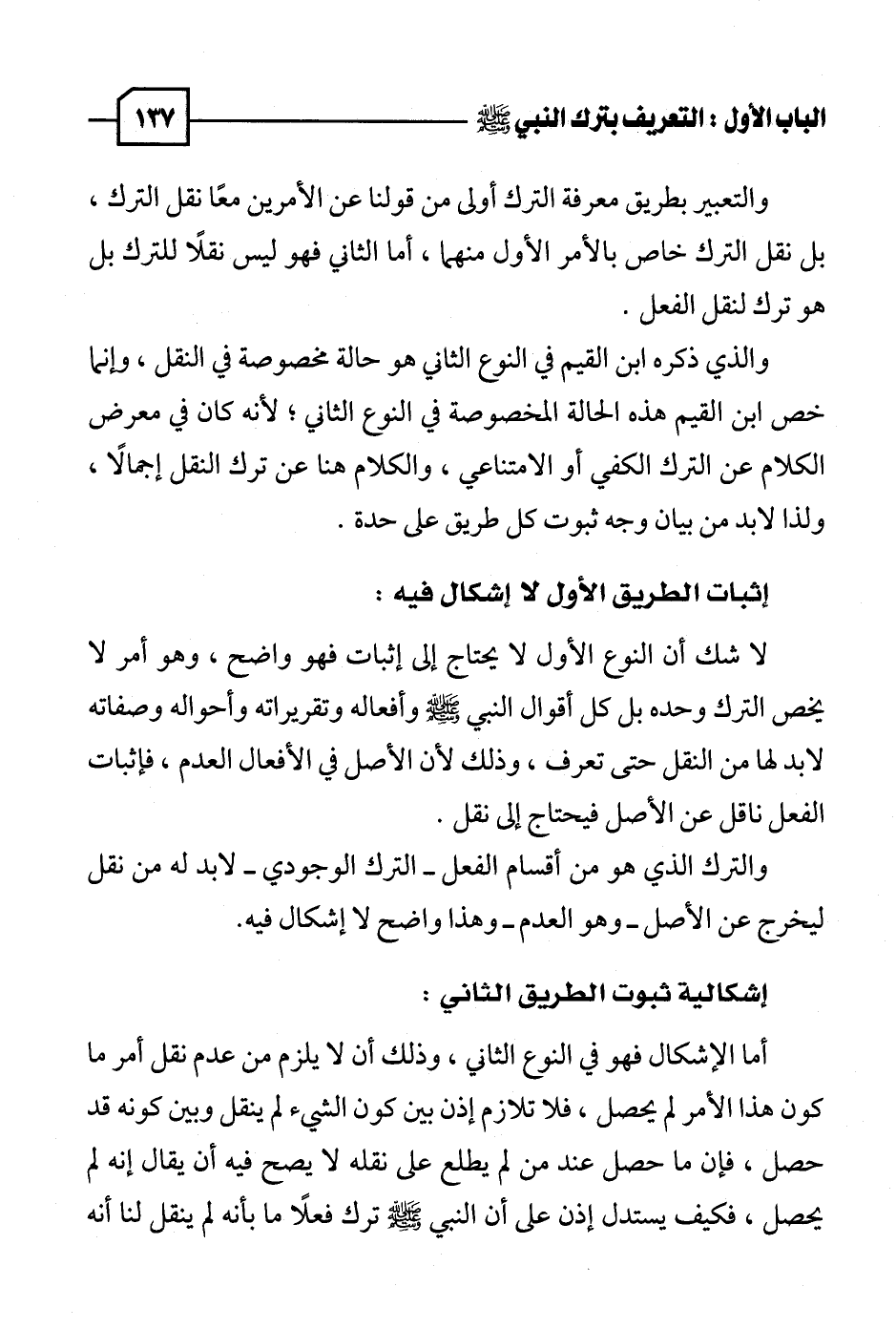 لا شك أن النوع الأول لا يحتاج إلى إثبات فهو واضح، وهو أمر لا يخص الترك وحده بل كل أقوال النبي - صلى الله عليه وسلم - وأفعاله وتقريراته وأحواله وصفاته لابد لها من النقل حتى تعرف، وذلك لأن الأصل في الأفعال العدم، فإثبات الفعل ناقل عن الأصل فيحتاج إلى نقل.