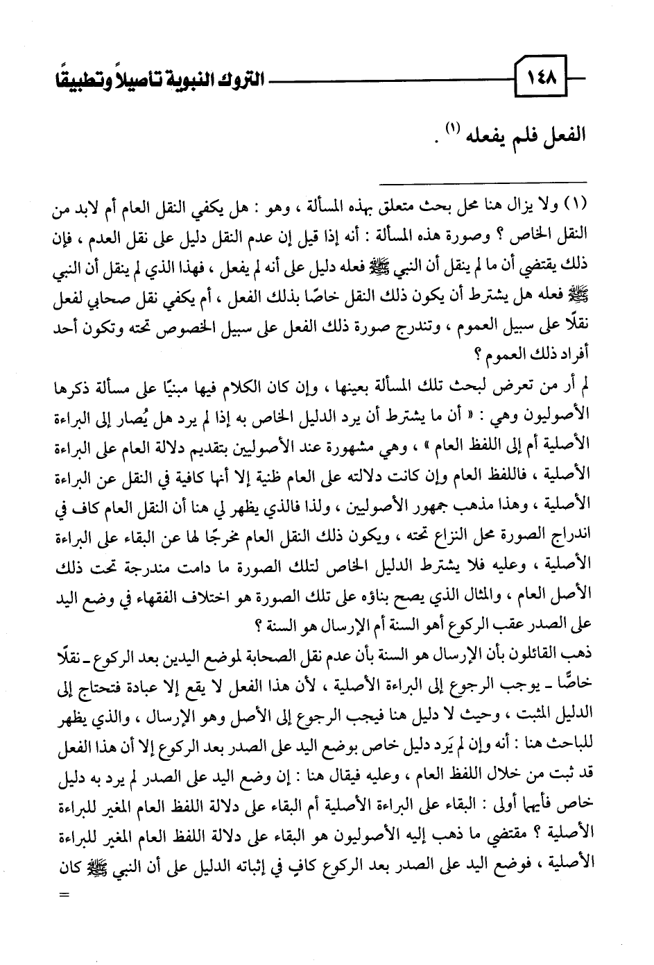 (١) ولا يزال هنا محل بحث متعلق بهذه المسألة، وهو: هل يكفي النقل العام أم لابد من النقل الخاص؟ وصورة هذه المسألة: أنه إذا قيل إن عدم النقل دليل على نقل العدم، فإن ذلك يقتضي أن ما لم ينقل أن النبي - صلى الله عليه وسلم - فعله دليل على أنه لم يفعل، فهذا الذي لم ينقل أن النبي - صلى الله عليه وسلم - فعله هل يشترط أن يكون ذلك النقل خاصًا بذلك الفعل، أم يكفي نقل صحابي لفعل نقلًا على سبيل العموم، وتندرج صورة ذلك الفعل على سبيل الخصوص تحته وتكون أحد أفراد ذلك العموم؟