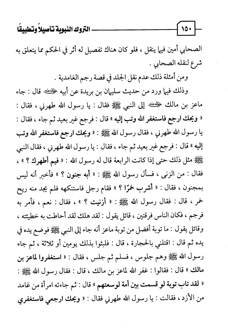 وذلك فيما ورد من حديث سليمان بن بريدة عن أبيه - رضي الله عنه - قال: جاء ماعز بن مالك - رضي الله عنه - إلى النبي - صلى الله عليه وسلم - فقال: يا رسول الله طهرني، فقال: "ويحك ارجع فاستغفر الله وتب إليه" قال: فرجع غير بعيد ثم جاء، فقال: يا رسول الله طهرني، فقال رسول الله - صلى الله عليه وسلم -: "ويحك ارجع فاستغفر الله وتب إليه" قال: فرجع غير بعيد ثم جاء، فقال: يا رسول الله طهرني، فقال النبي - صلى الله عليه وسلم - مثل ذلك حتى إذا كانت الرابعة قال له رسول الله: "فيم أطهرك؟ "، فقال: من الزنى، فسأل رسول الله - صلى الله عليه وسلم -: "أبه جنون؟ " فأخبر أنه ليس بمجنون، فقال: "أشرب خمرًا؟ " فقام رجل فاستنكهه فلم يجد منه ريح خمر، قال: فقال رسول الله - صلى الله عليه وسلم -: "أزنيت؟ "، فقال: نعم، فأمر به فرجم، فكان الناس فرقتين، قائل يقول: لقد هلك لقد أحاطت به خطيئته، وقائل يقول: ما توبة أفضل من توبة ماعز أنه جاء إلى النبي - صلى الله عليه وسلم - فوضع يده في يده ثم قال: اقتلني بالحجارة، قال: فلبثوا بذلك يومين أو ثلاثة، ثم جاء رسول الله - صلى الله عليه وسلم - وهم جلوس، فسلم ثم جلس، فقال: "استغفروا لماعز بن مالك" قال: فقالوا: غفر الله لماعز بن مالك، قال: فقال رسول الله - صلى الله عليه وسلم -: "لقد تاب توبة لو قسمت بين أمة لوسعتهم" قال: ثم جاءته امرأة من غامد من الأزد، فقالت: يا رسول الله طهرني فقال: "ويحك ارجعي فاستغفري