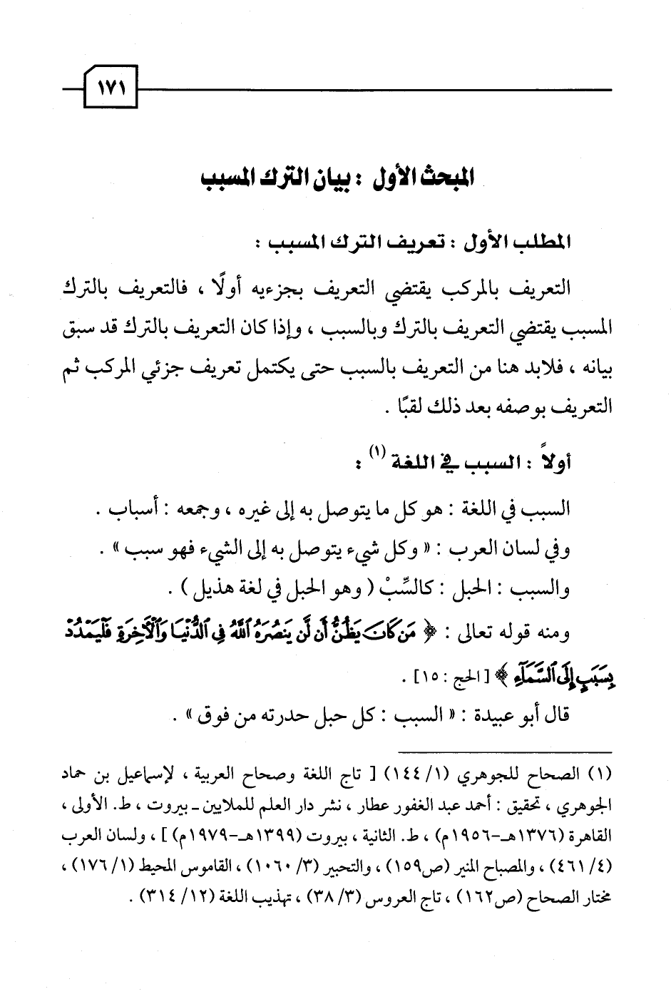 التعريف بالمركب يقتضي التعريف بجزءيه أولًا، فالتعريف بالترك المسبب يقتضي التعريف بالترك وبالسبب، وإذا كان التعريف بالترك قد سبق بيانه، فلابد هنا من التعريف بالسبب حتى يكتمل تعريف جزئي المركب ثم التعريف بوصفه بعد ذلك لقبًا.