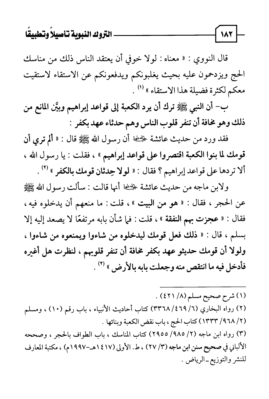 ب - أن النبي - صلى الله عليه وسلم - ترك أن يرد الكعبة إلى قواعد إبراهيم وبيَّن المانع من ذلك وهو مخافة أن تنفر قلوب الناس وهم حدثاء عهد بكفر: