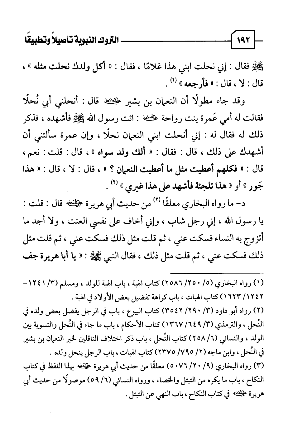 (٢) رواه أبو داود (٣/ ٢٩٠ / ٣٥٤٢) كتاب البيوع، باب في الرجل يفضل بعض ولده في النُحل، والترمذي (٣/ ٦٤٩ / ١٣٦٧) كتاب الأحكام، باب ما جاء في النُحل والتسوية بين الولد، والنسائي (٦/ ٢٥٨) كتاب النُّحل، باب ذكر اختلاف الناقلين لخبر النعمان بن بشير في النُّحل، وابن ماجه (٢/ ٧٩٥ / ٢٣٧٥) كتاب الهبات، باب الرجل ينحل ولده.