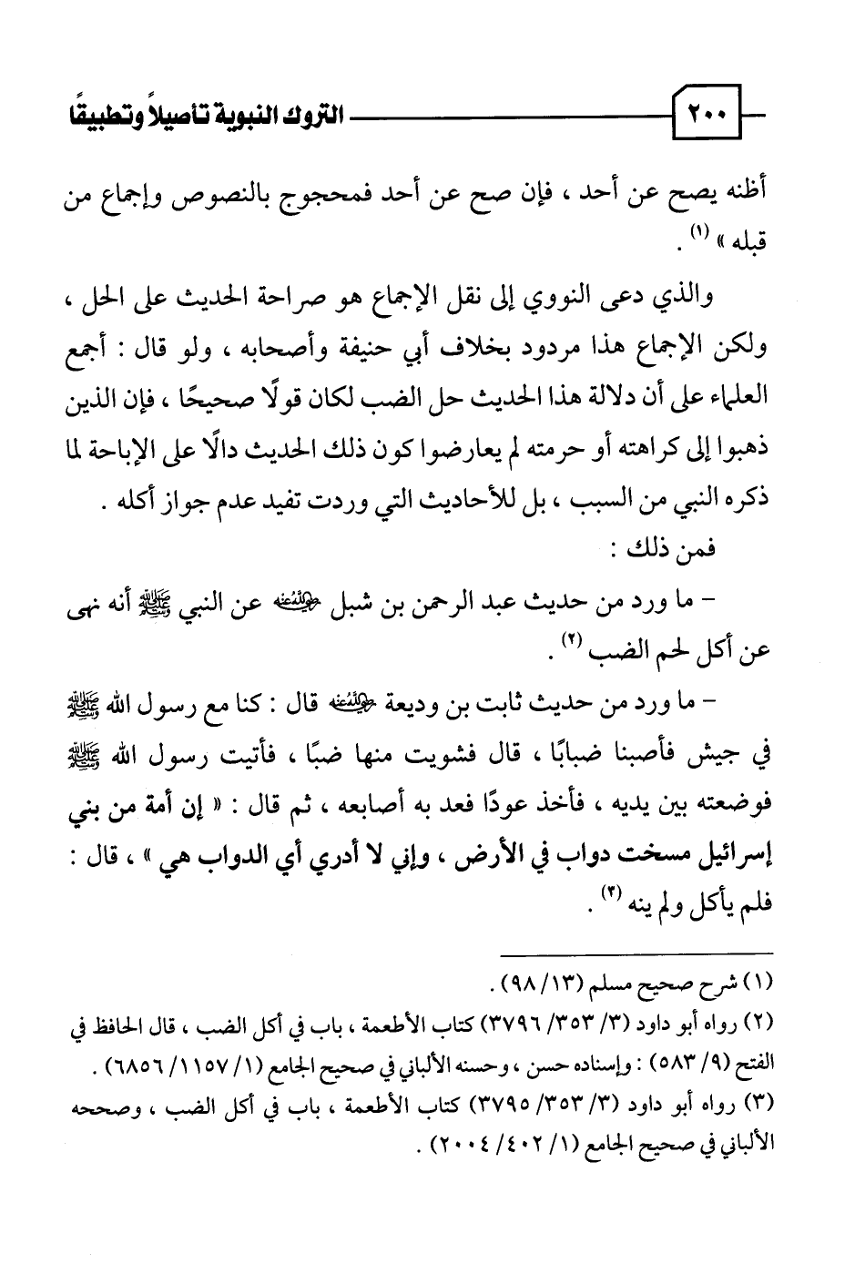 (٣) رواه أبو داود (٣/ ٣٥٣ / ٣٧٩٥) كتاب الأطعمة، باب في أكل الضب، وصححه الألباني في صحيح الجامع (١/ ٤٠٢ / ٢٠٠٤).
