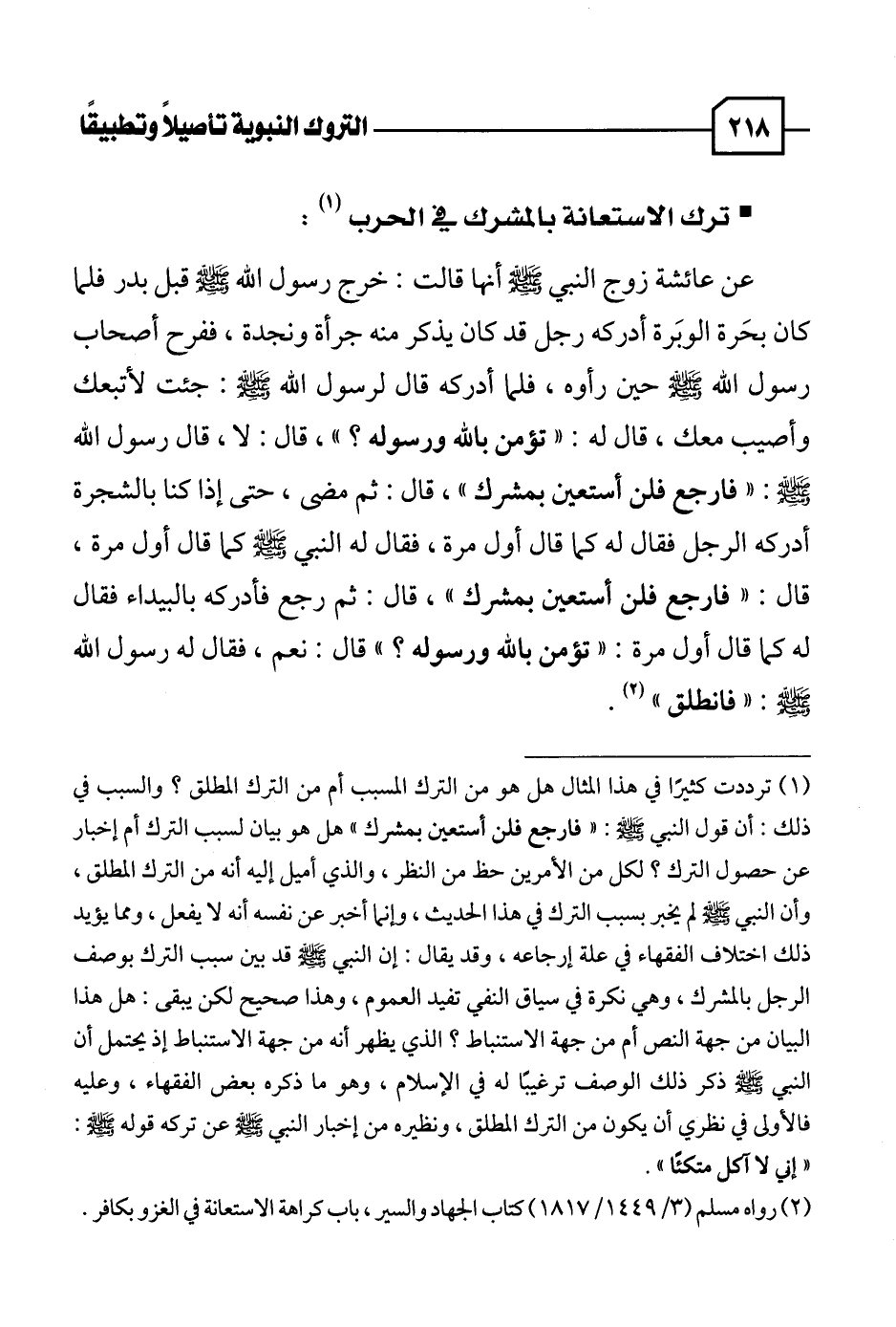 (١) ترددت كثيرًا في هذا المثال هل هو من الترك المسبب أم من الترك المطلق؟ والسبب في ذلك: أن قول النبي - صلى الله عليه وسلم -: "فارجع فلن أستعين بمشرك" هل هو بيان لسبب الترك أم إخبار عن حصول الترك؟ لكل من الأمرين حظ من النظر، والذي أميل إليه أنه من الترك المطلق، وأن النبي - صلى الله عليه وسلم - لم يخبر بسبب الترك في هذا الحديث، وإنما أخبر عن نفسه أنه لا يفعل، ومما يؤيد ذلك اختلاف الفقهاء في علة إرجاعه، وقد يقال: إن النبي - صلى الله عليه وسلم - بين سبب الترك بوصف الرجل بالمشرك، وهي نكرة في سياق النفي تفيد العموم، وهذا صحيح لكن يبقى: هل هذا البيان من جهة النص أم من جهة الاستنباط؟ الذي يظهر أنه من جهة الاستنباط إذ يحتمل أن النبي - صلى الله عليه وسلم - ذلك الوصف ترغيبًا له في الإسلام، وهو ما ذكره بعض الفقهاء، وعليه فالأولى في نظري أن يكون من الترك المطلق، ونظيره من إخبار النبي - صلى الله عليه وسلم - عن تركه قوله - صلى الله عليه وسلم -: "إني لا آكل متكئًا".