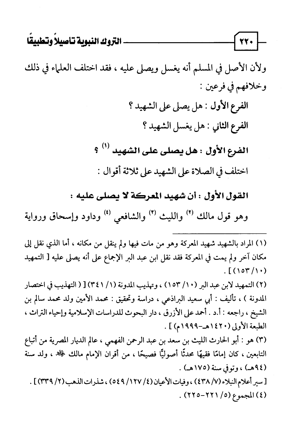 (١) المراد بالشهيد شهيد المعركة وهو من مات فيها ولم ينقل من مكانه، أما الذي نقل إلى مكان آخر ولم يمت في المعركة فقد نقل ابن عبد البر الإجماع على أنه يصلى عليه [التمهيد (١٠/ ١٥٣)].