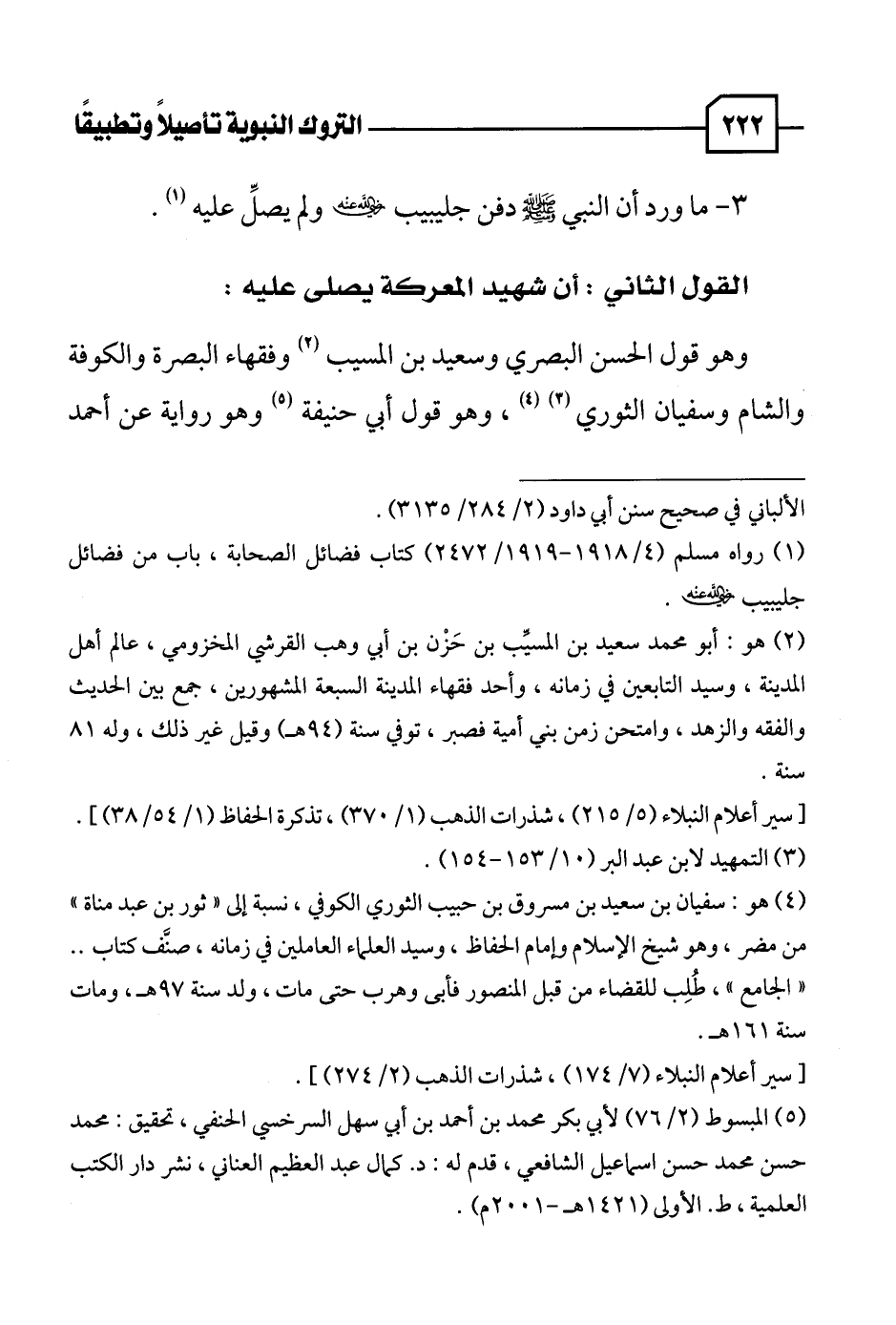 ٣ - ما ورد أن النبي - صلى الله عليه وسلم - دفن جليبيب - رضي الله عنه - ولم يصلِّ عليه (١).