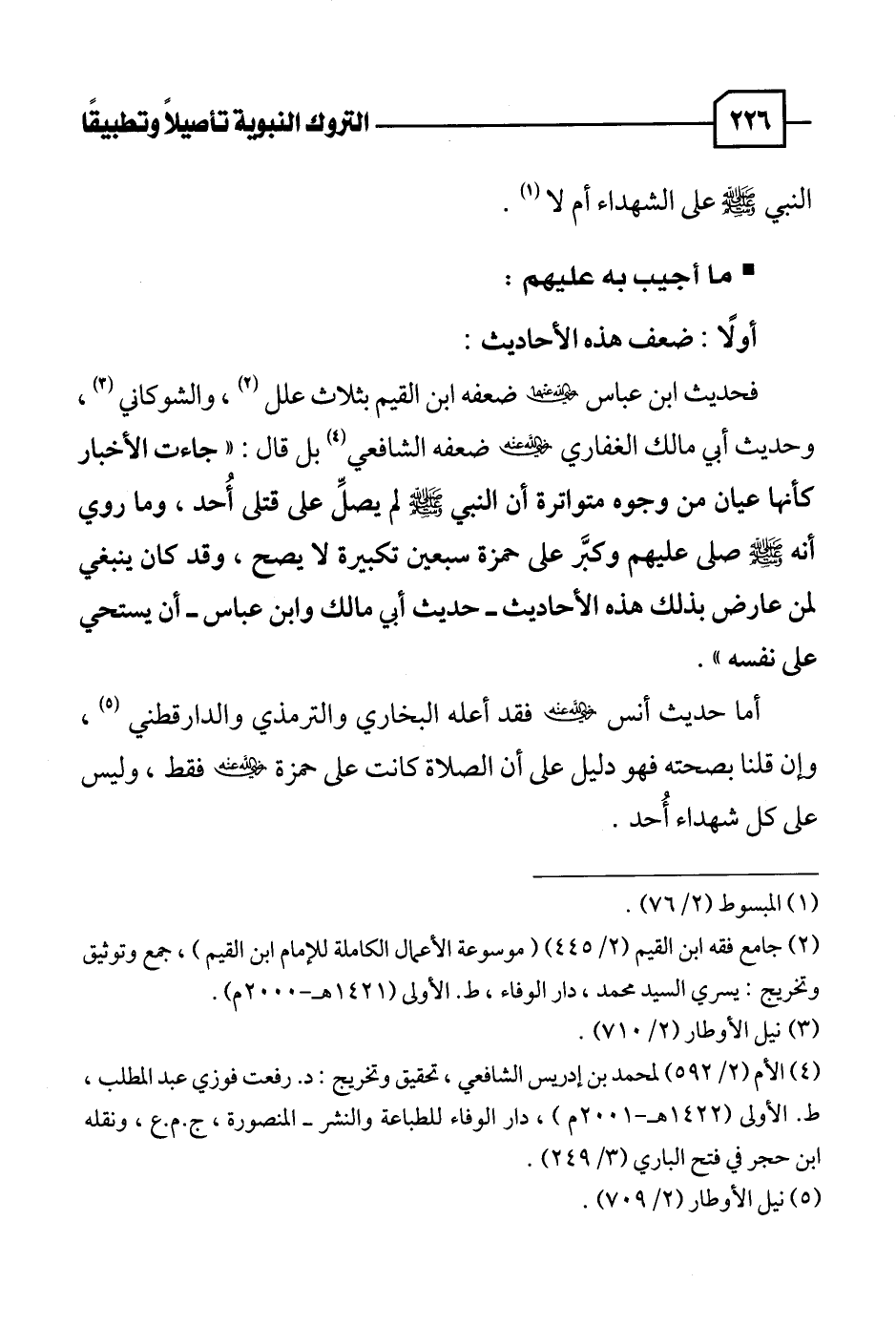 أما حديث أنس - رضي الله عنه - فقد أعله البخاري والترمذي والدارقطني (٥)، وإن قلنا بصحته فهو دليل على أن الصلاة كانت على حمزة - رضي الله عنه - فقط، وليس على كل شهداء أُحد.