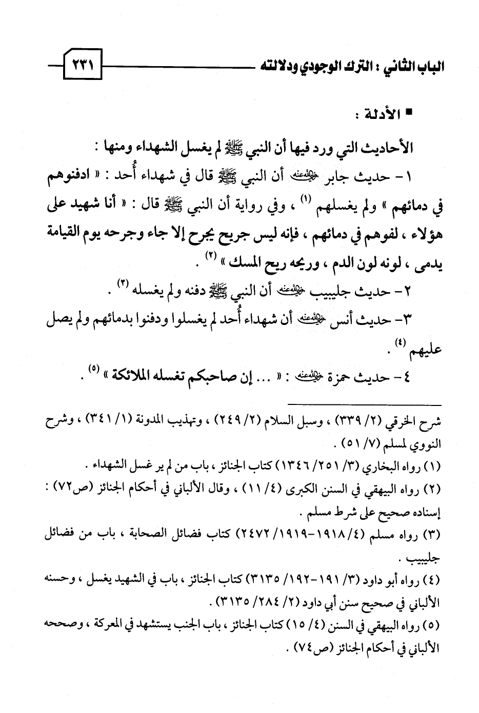 ١ - حديث جابر - رضي الله عنه - أن النبي - صلى الله عليه وسلم - قال في شهداء أُحد: "ادفنوهم في دمائهم" ولم يغسلهم (١)، وفي رواية أن النبي - صلى الله عليه وسلم - قال: " أنا شهيد على هؤلاء، لفوهم في دمائهم، فإنه ليس جريح يجرح إلا جاء وجرحه يوم القيامة يدمى، لونه لون الدم، وريحه ريح المسك" (٢).