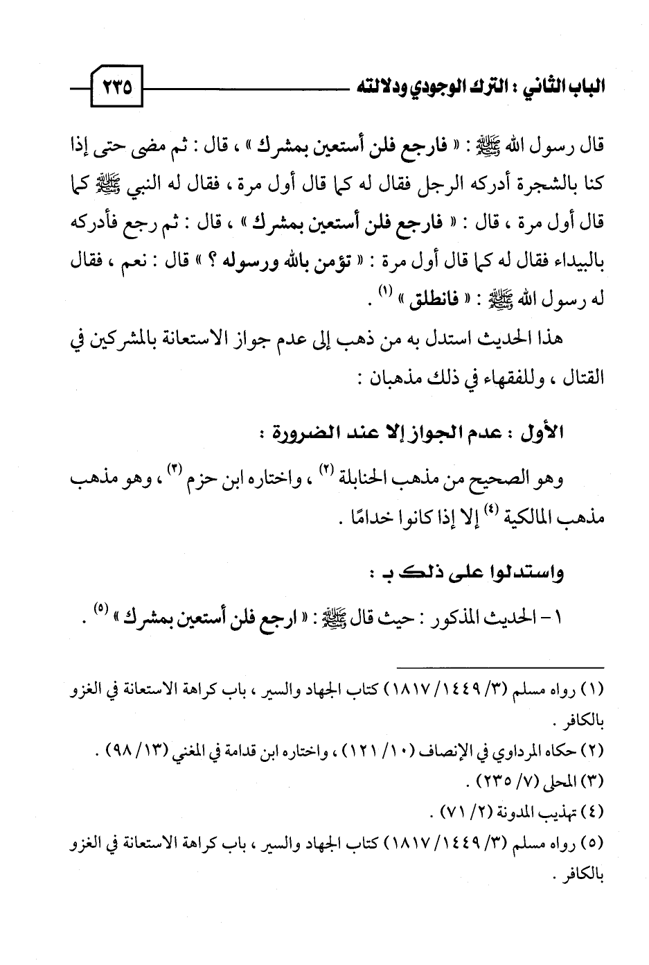 ١ - الحديث المذكور: حيث قال - صلى الله عليه وسلم -: "ارجع فلن أستعين بمشرك" (٥)