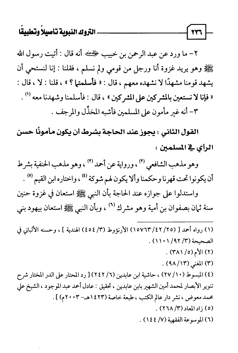 ٢ - ما ورد عن عبد الرحمن بن خبيب - رضي الله عنه - أنه قال: أتيت رسول الله - صلى الله عليه وسلم - وهو يريد غزوة أنا ورجل من قومي ولم نسلم، فقلنا: إنا لنستحي أن يشهد قومنا مشهدًا لا نشهده معهم، قال: "فاسلمتما؟ "، قلنا: لا، قال: "فإنا لا نستعين بالمشركين على المشركين"، قال: فاسلمنا وشهدنا معه (١).