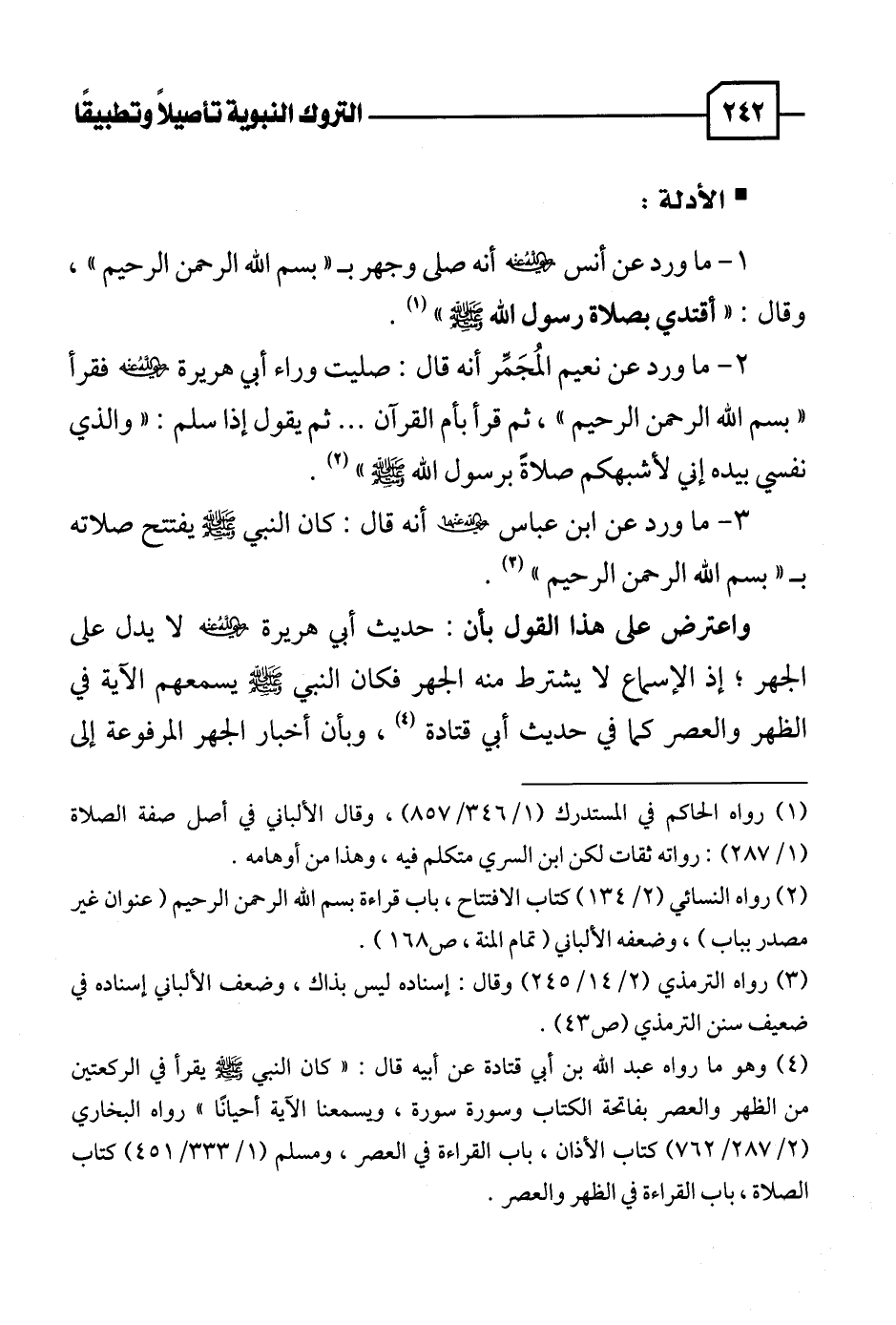 ٢ - ما ورد عن نعيم المُجَمِّر أنه قال: صليت وراء أبي هريرة - رضي الله عنه - فقرأ "بِسْمِ اللَّهِ الرَّحْمَنِ الرَّحِيمِ"، ثم قرأ بأم القرآن ... ثم يقول إذا سلم: "والذي نفسي بيده إني لأشبهكم صلاةً برسول الله - صلى الله عليه وسلم - " (٢).