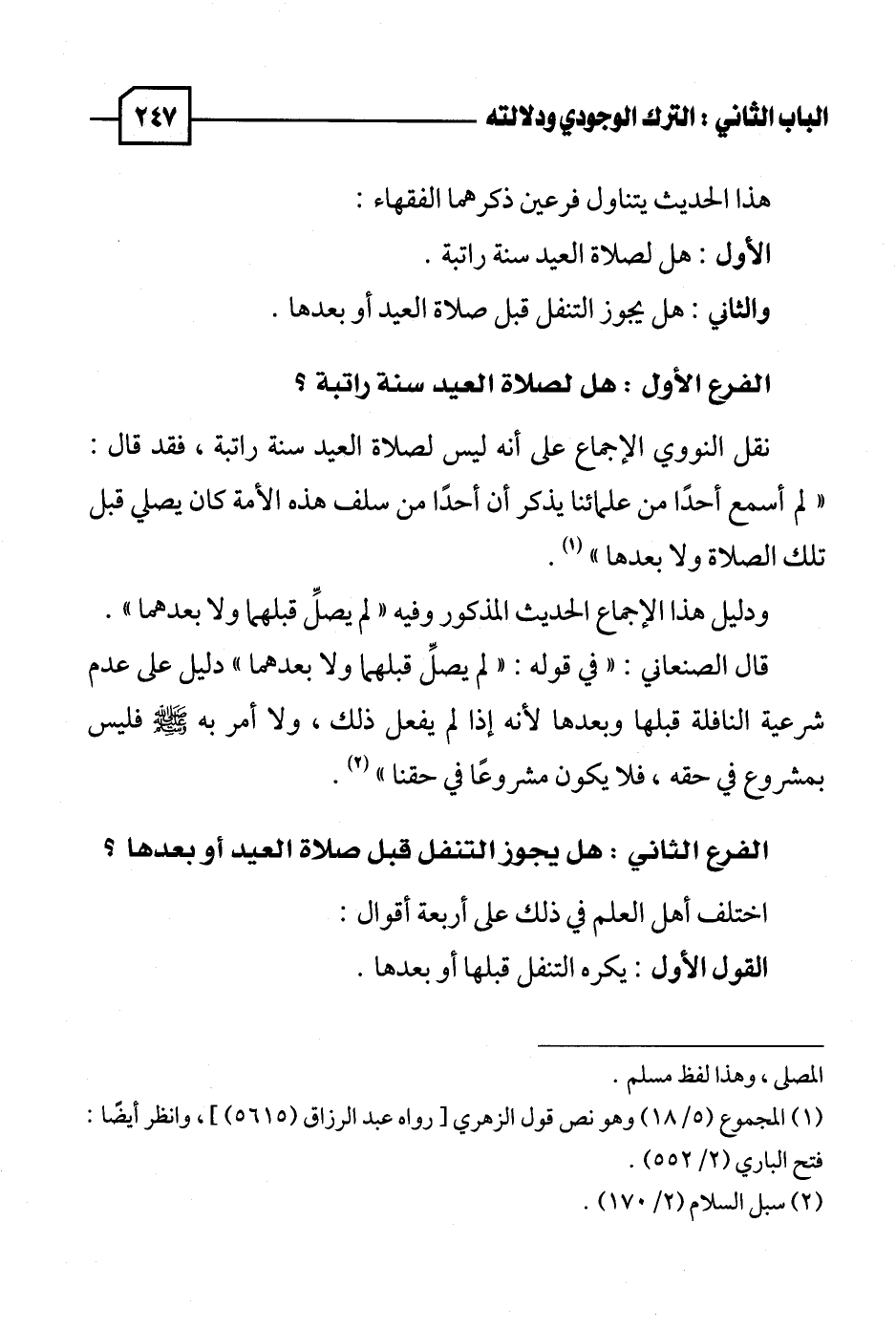 الفرع الأول: هل لصلاة العيد سنة راتبة؟