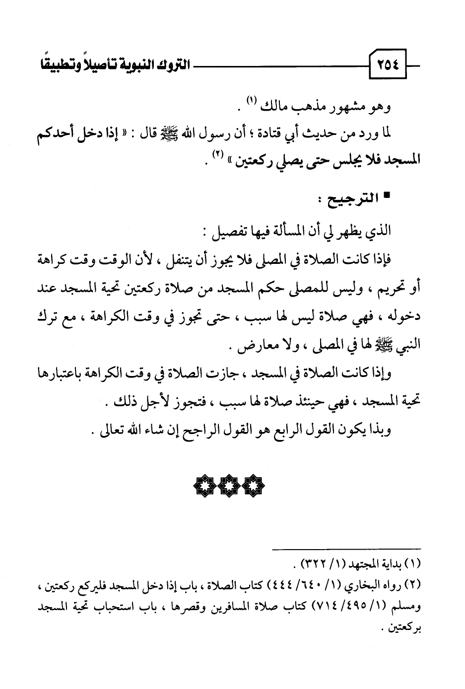 (٢) رواه البخاري (١/ ٦٤٠ / ٤٤٤) كتاب الصلاة، باب إذا دخل المسجد فليركع ركعتين، ومسلم (١/ ٤٩٥ / ٧١٤) كتاب صلاة المسافرين وقصرها، باب استحباب تحية المسجد بركعتين.