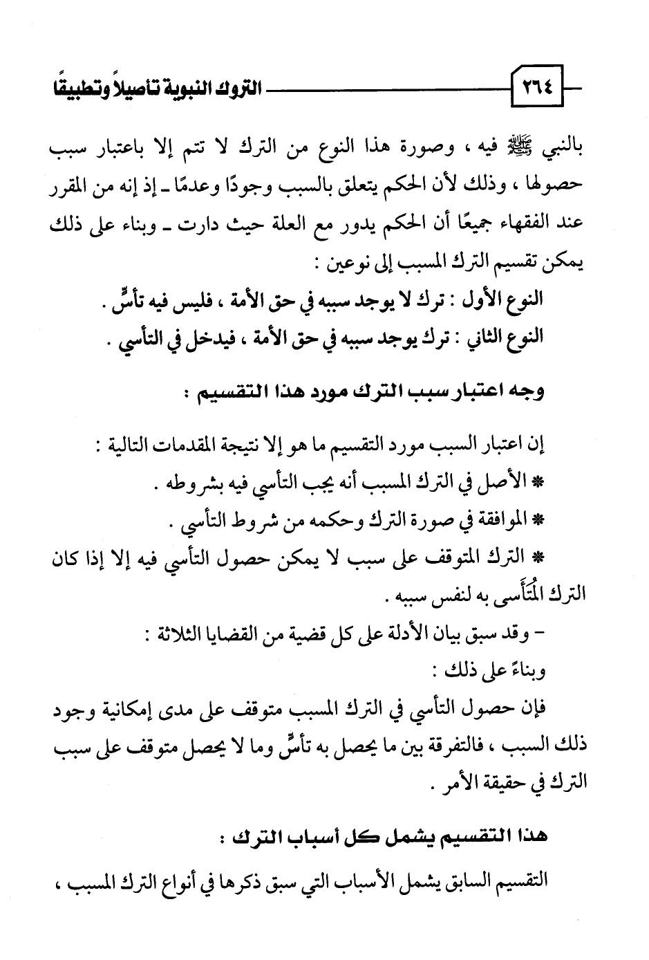 بالنبي - صلى الله عليه وسلم - فيه، وصورة هذا النوع من الترك لا تتم إلا باعتبار سبب حصولها، وذلك لأن الحكم يتعلق بالسبب وجودًا وعدمًا - إذ إنه من المقرر عند الفقهاء جميعًا أن الحكم يدور مع العلة حيث دارت - وبناء على ذلك يمكن تقسيم الترك المسبب إلى نوعين: