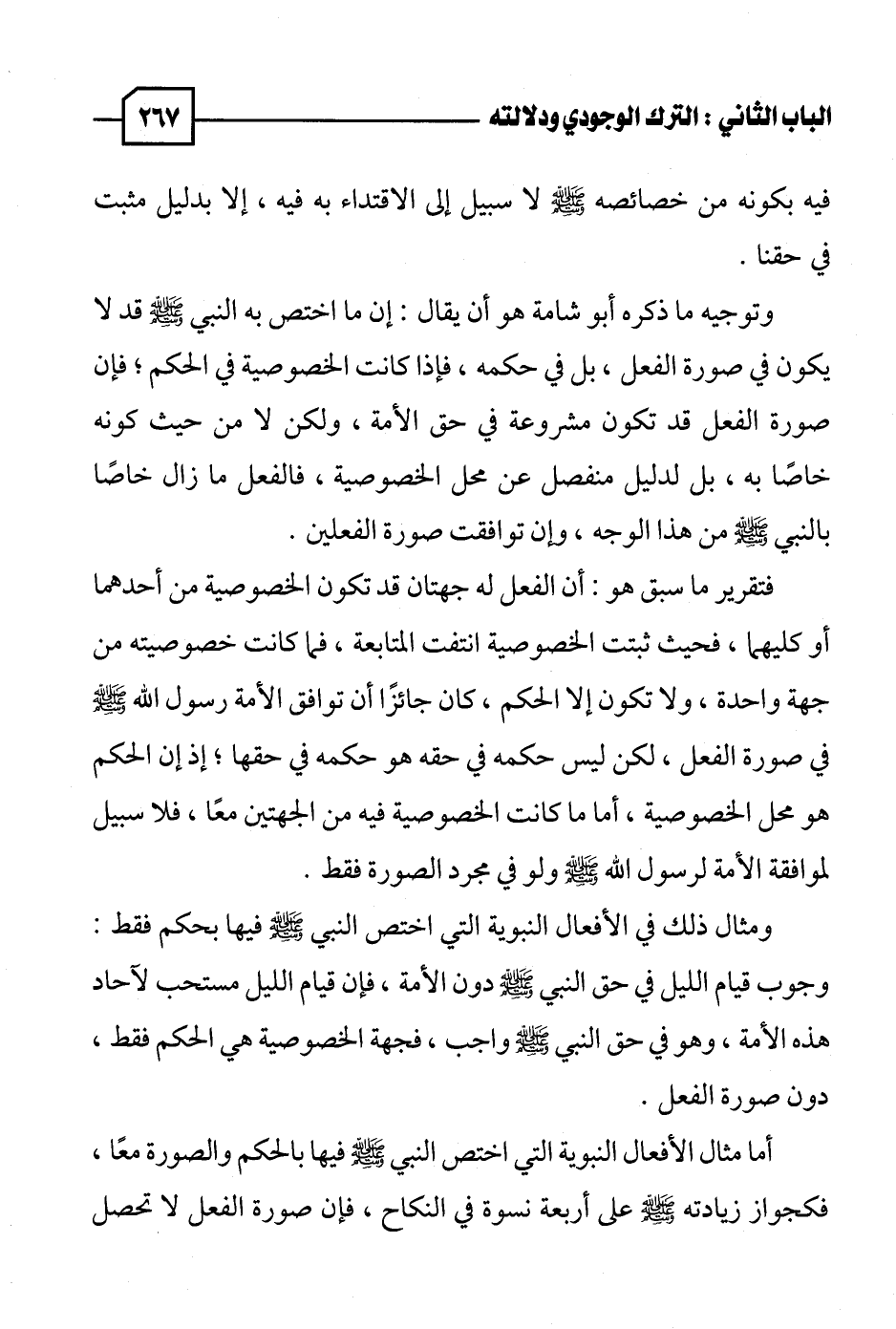 ومثال ذلك في الأفعال النبوية التي اختص النبي - صلى الله عليه وسلم - فيها بحكم فقط: وجوب قيام الليل في حق النبي - صلى الله عليه وسلم - دون الأمة، فإن قيام الليل مستحب لآحاد هذه الأمة، وهو في حق النبي - صلى الله عليه وسلم - واجب، فجهة الخصوصية هي الحكم فقط، دون صورة الفعل.