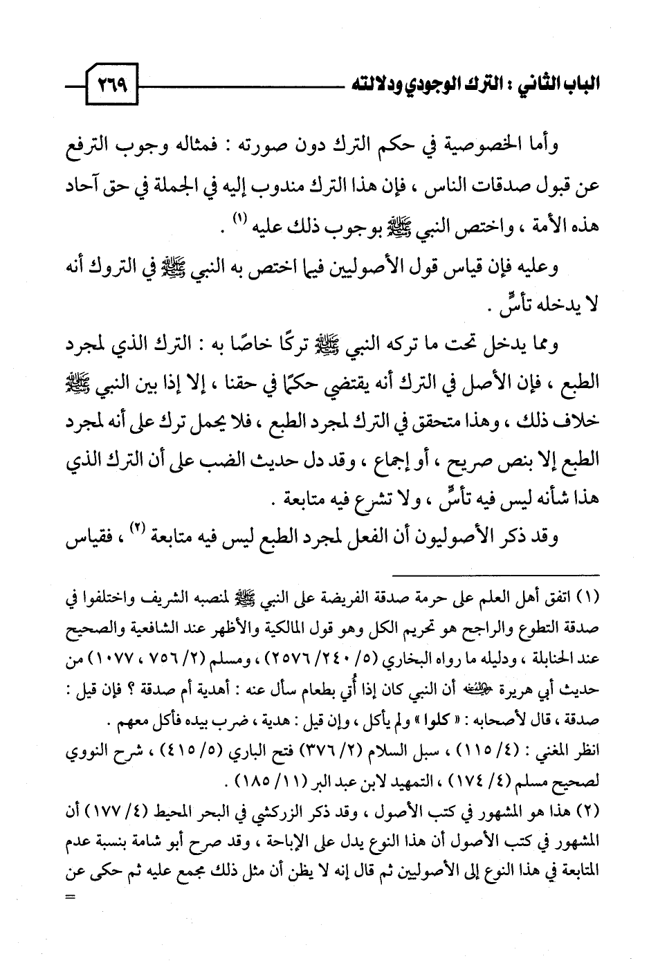 وأما الخصوصية في حكم الترك دون صورته: فمثاله وجوب الترفع عن قبول صدقات الناس، فإن هذا الترك مندوب إليه في الجملة في حق آحاد هذه الأمة، واختص النبي - صلى الله عليه وسلم - بوجوب ذلك عليه (١).