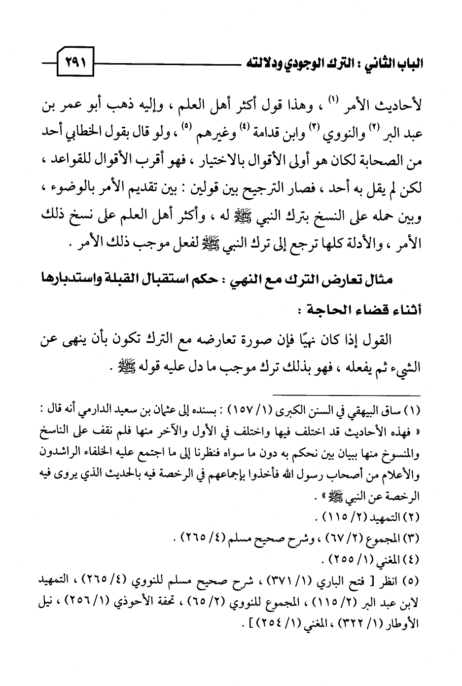 مثال تعارض الترك مع النهي: حكم استقبال القبلة واستدبارها أثناء قضاء الحاجة: