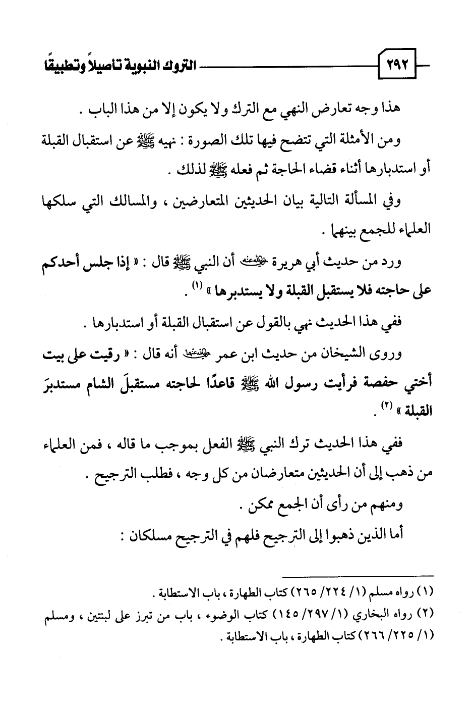 (٢) رواه البخاري (١/ ٢٩٧ / ١٤٥) كتاب الوضوء، باب من تبرز على لبنتين، ومسلم (١/ ٢٢٥ / ٢٦٦) كتاب الطهارة، باب الاستطابة.