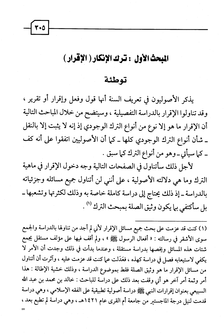 لأجل ذلك سأتناول في الصفحات التالية وجه دخول الإقرار في ماهية الترك وما هي دلالته الأصولية، على أنني لن أتناول جميع مسائله وجزئياته بالدراسة - إذ ذلك يحتاج إلى دراسة كاملة خاصة به وذلك لكثرتها وتشعبها - بل سأكتفي بما يكون وثيق الصلة بمبحث الترك (١).