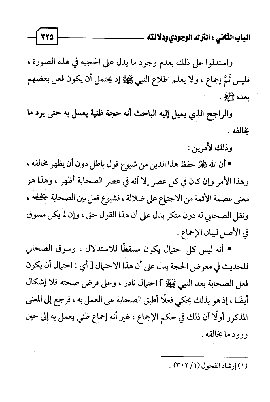 * أنه ليس كل احتمال يكون مسقطًا للاستدلال، وسوق الصحابي للحديث في معرض الحجة يدل على أن هذا الاحتمال [أي: احتمال أن يكون فعل الصحابة بعد النبي - صلى الله عليه وسلم -] احتمال نادر، وعلى فرض صحته فلا إشكال أيضًا، إذ هو بذلك يحكي فعلًا أطبق الصحابة على العمل به، فرجع إلى المعنى المذكور أولًا أن ذلك في حكم الإجماع، غير أنه إجماع ظني يعمل به إلى حين ورود ما يخالفه.